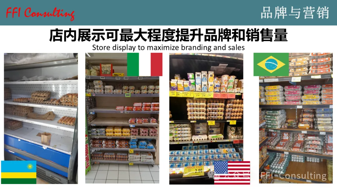 包装并非促使消费者在超市购买鸡蛋的唯一因素。我们在零售店中陈列鸡蛋的方式也会影响消费者的购买意愿。卢旺达、意大利、美国和巴西的鸡蛋柜台照片清楚地表明,我们必须改进鸡蛋的陈列方式才能吸引消费者。在许多国家,鸡蛋的陈列方式并不理想,但幸运的是,消费者仍然愿意购买鸡蛋,而不在乎商店的陈列效果。我认为,中国拥有一些最优秀的鸡蛋陈列方式。这方面,世界应该向中国学习,而不是中国向世界学习!