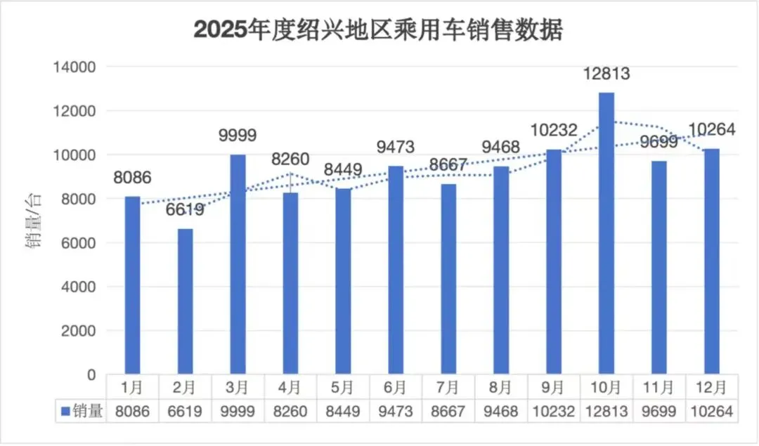 12月收官之月,虽然受到以旧换新补贴退坡、消费者观望情绪等因素影响,但是部分品牌年末冲量促销,加上返乡潮的到来,促进了传统燃油车的销量。同时,新能源问界、小鹏、蔚来等多家车企推出“购置税兜底方案”,承诺为年底前下单用户承担潜在的税额差值,有效稳定了消费者预期,成为支撑车市的核心力量。数据显示,绍兴地区12月乘用车总销量为10264台,环比上涨5.8%,同比下降26%,累计同比下降4.2%。其中,新能源汽车销量达5414台,占总量的52.7%。