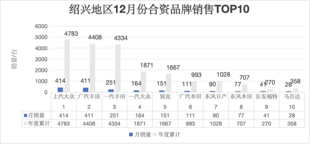 据统计,12月绍兴合资品牌汽车总销量为2011台,月同比下降40.3%,月环比下降4.2%,累计同比下降11.7%。排名前三的为上汽大众、广汽丰田、一汽丰田,分别销售414台、411台、251台。具体销量排行如下: