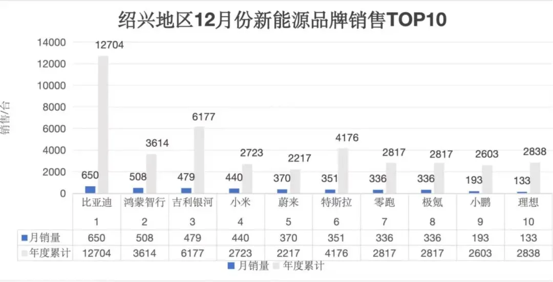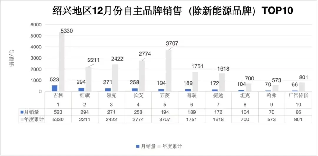 据统计,12月绍兴自主品牌汽车总销量为6428台(含新能源),月同比下降20.9%,月环比上涨7.6%,累计同比上涨7.5%。排名前三的为吉利、红旗、领克,分别销售523台、294台、271台。具体销量排行如下: