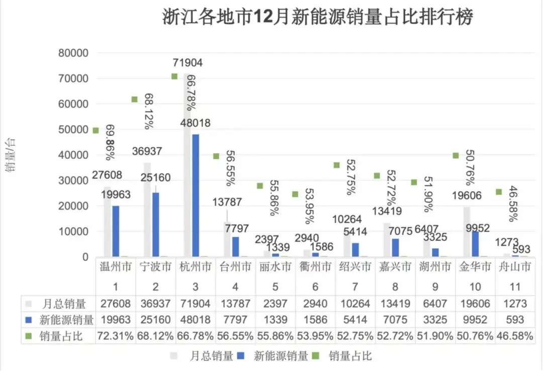据统计,浙江各地市11月新能源汽车销量绍兴位居第7,新能源销量5414台,占总量的52.75%。 具体销量如下: