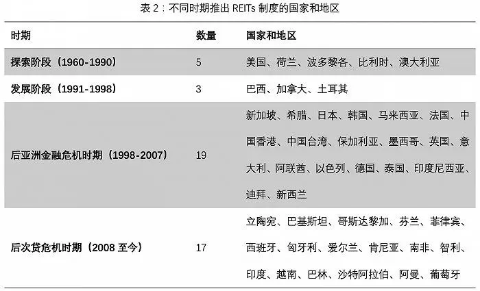2021年1月30日,沪深两市交易所正式发布REITs业务配套规则,为基础设施公募REITs业务明确了相关业务流程、审查标准和发售流程。这是自2020年8月7日证监会正式发布《公开募集基础设施证券投资基金指引(试行)》以来,公募REITs试点工作中的又一阶段性进展。公募REITs试点工作推进迅速,距离发改委与证监会发布《关于推进基础设施领域不动产投资信托基金(REITs)试点相关工作的通知》仅9个月,已有多项配套规则、自律规则发布。公募REITs的落地箭在弦上。REITs的英文全称为Real Estate Investment Trusts,即不动产投资信托基金。指依法向社会投资者发行收益凭证公开募集资金,通过不动产支持证券等特殊目的载体持有不动产项目,由管理人主动管理运营上述项目,并将产生的绝大部分收益分配给投资者的标准化金融产品。中国本次进行试点的主要为基础设施REITs,以基础设施项目产生的现金流为偿付来源,以基础设施资产支持专项计划为载体,向投资者发行的代表基础设施财产或财产权益份额的有价证券。基础设施项目主要包括仓储物流,收费公路、机场港口等交通设施,水电气热等市政设施,污染治理、信息网络、产业园区等其他基础设施。中国的基础设施REITs采取的交易架构中,在公募基金和底层资产之间还有一层是资产支持证券。通过加入资产支持证券的中间层,可以使得公募基金突破限制直接投资非上市公司的股权。REITs拥有投向明确、强制分红、税收优惠、低杠杆限制等特点。其中最为重要的特点是强制分红和税收优惠。REITs通过设置强制分红比例,可以将投资经营获得的收益高比例地分配给投资者。这使得REITs投资者可以获得持续稳定的投资收益。在美国市场中,权益型REITs的股息率在绝大部分时间内都高于美国10年期国债收益率。另外大多数国家对REITs中的租金收入等一般性收入进行所得税免除,防止了双重征税,保持了税收中性原则。资料来源:ERPA Global REIT Survey 2020、东方证券财富研究中心REITs的实践始于1960年的美国。1960年美国国会修改《国内税收法典》,给予了REITs和共同基金同等的税收优惠。使其拥有税收中性特征,为REITs的诞生奠定了制度基础。REITs近60年的发展大致可以分为以下4个阶段。1960-1990年间,只有美国、荷兰、澳大利亚、波多黎各等少数国家制定了与REITs相关的规则政策。这一阶段是REITs的探索阶段,全球市场REITs规模不大,许多制度设计也尚未成熟。1991年-1998年间,REITs迎来了大发展。一方面美国《税收改革法案》从制度上给予了REITs税收优惠。另一方面伴随美国房地产行业的繁荣,通过REITs进行融资、盘活资产。提高资金周转率的优势开始显现。美国REITs市场迎来了大规模增长。1999-2007年间的后亚洲金融危机时期,金融危机对亚太主要市场带来了较大冲击。一些国家的不动产市场陷入低迷。在这种背景下,日本、新加坡、中国香港等亚太主要市场陆续推出REITs相关政策规则,使得REITs在亚太市场获得了发展。同一时期,英国、法国、德国、意大利等欧洲主要发达国家也推出了REITs相关政策规则。在这一时期,全球主要发达国家和地区均推出了REITs,相关市场和制度不断健全完善。2008至今的后次贷危机时期,美国房地产市场受到极大冲击,REITs出现大幅回撤,总市值降低38.57%。但是随后市场得到迅速修复,并走出长达十年的上涨。在这一时期REITs市场的发展开始由发达国家逐渐拓展至发展中国家,非洲、中东、东南亚地区部分国家也纷纷出台REITs制度。资料来源:ERPA Global REIT Survey 2020、东方证券财富研究中心从市场规模来看,全球REITs市场中前五大市场为美国、日本、澳大利亚、英国、新加坡。其REITs市场规模分别为9808亿欧元、1080亿欧元、711亿欧元、585亿欧元和581亿欧元。美国是全球最大的REITs市场,其REITs在全球REITs指数的占比达到了66.41%,占到全球约三分之二的份额。资料来源:ERPA Global REIT Survey 2020、东方证券财富研究中心美国REITs经历了60年的发展,已成为全球最为成熟的REITs市场。研究文献一般将美国REITs市场分为如下七个发展阶段:(1)起步阶段(1960-1968年),这一阶段的标志性事件有两个,一是1960年美国通过《国内税收法》,二是同年美国国会颁布了《房地产投资信托法案》。前者从法律层面给予了REITs税收中性特征,可以在对投资者进行收入分配时免征所得税。在此之前进行分红先得缴纳高额所得税,这降低了REITs的投资收益及其竞争力。后者则标志着REITs制度的正式建立。但是《房地产投资信托法案》出台后的数年内,REITs发展十分缓慢。这主要是由于这一时期美国市场还存在另一种名为“房地产有限合伙”(Real Estate Limited Partnership,RELP)的投资产品。RELP可以使用加速折旧记账法为投资者提供税收抵扣,因此受到了投资者的欢迎。REITs相较之下税收优势并不明显,市场发展缓慢。(2)快速扩张阶段(1969-1972年),这一阶段的标志性事件是美国市场放开抵押型REITs。这一阶段由于石油危机的影响,美国通货膨胀严重。但是美国却对银行存款利率设置了上限,银行信贷机构难以获得足够储蓄资金。在这种大背景下房地产行业难以获得充足的信贷支持。而抵押型REITs作为证券,其出现绕过了信贷利率的限制。使得其能够以较高收益率吸引投资者资金,并向房地产企业提供信贷支持。因此REITs迎来了第一次大发展,截至1972年底,美国REITs市场规
