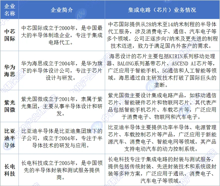 中国集成电路(芯片)行业近几年处于在国际市场封锁下逆势突破的阶段。当前中芯国际是中国最大的半导体代工厂,主要提供28纳米至14纳米制程;华为海思则专注于芯片设计,主要推出Kirin系列和5G芯片;紫光国微在物联网和通信芯片方面具备优势;比亚迪半导体致力于新能源汽车芯片的研发。随着国家政策支持和技术进步,中国芯片企业正在加速技术突破,逐步缩小与国际巨头的差距。