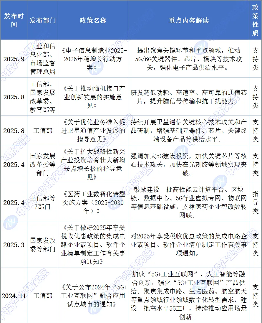 在政策方面,2025年8月,工信部印发《关于优化业务准入促进卫星通信产业发展的指导意见》,提出:持续开展卫星通信关键核心技术攻关和产品研制,增强基础元器件、芯片、关键终端设备产品等供给水平。2025年8月,工信部、国家发展改革委、教育部等联合印发《关于推动脑机接口产业创新发展的实施意见》,提出:研发超低功耗、高速率、高可靠的通信芯片,提升脑信号传输和抗干扰能力。2025年9月,工业和信息化部、市场监督管理总局联合印发《电子信息制造业2025-2026年稳增长行动方案》,提出聚焦关键环节和重点领域,推动5G/6G关键器件、芯片、模块等技术攻关,强化电子产品供给水平。