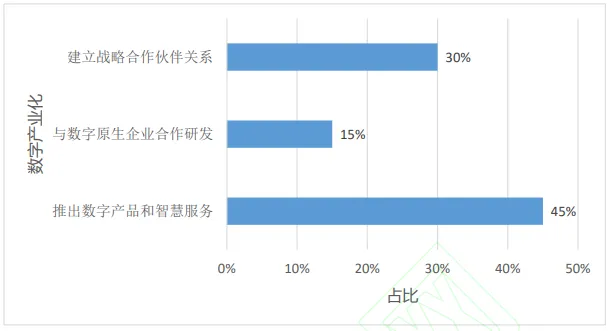勘察设计企业的数字产业化正呈现出强劲的发展势头,为企业开辟了新的增长空间。调查显示,约45%的企业已经成功研发并推出了针对特定领域的数字产品和智慧服务,涵盖了智慧楼宇、智慧电厂、智慧电网、智慧交通、智慧园区等多个领域,为传统建筑行业注入了新的活力。预计在未来五年内这些新兴业务的收入占比将从现在的10%增长到25%。此外,约15%的企业与数字原生企业合作研发数智化产品,培育发展新动能。通过整合优势资源,探索一条从传统勘察设计向高科技、高附加值业务转型的路径。同时,约30%的企业已经建立起战略合作伙伴关系,通过数据与资源共享,扩大了业务范围,增强了市场响应速度,提高了服务质量和客户满意度,为勘察设计企业带来了更加广阔的市场机遇。