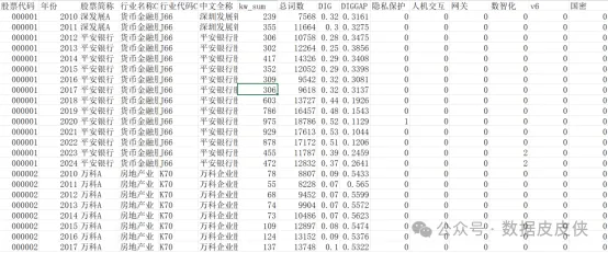 股票代码 | 年份 | 股票简称 | 行业名称C | 行业代码C | 中文全称 | kw_sum | 总词数 |