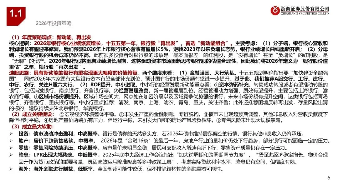 (2)分母端,投资银行股的机会成本仍然不高。此前很多投资者对银行股的印象是“基本面很差”的红利股,是“没有增长”甚至“负增长”的红利股,是“无聊”的资产。2026年银行股将重启业绩增长周期,这将驱动资本市场重新思考银行股的估值合理性,因此我们将2026年定义为“银行股价值重估”之年,银行股“再次出发”。