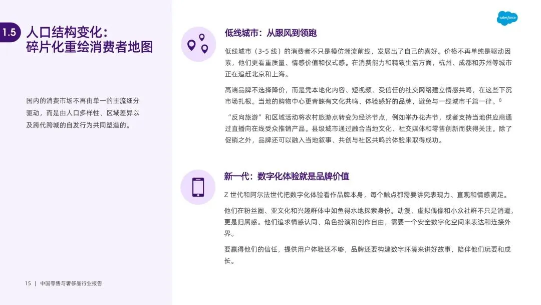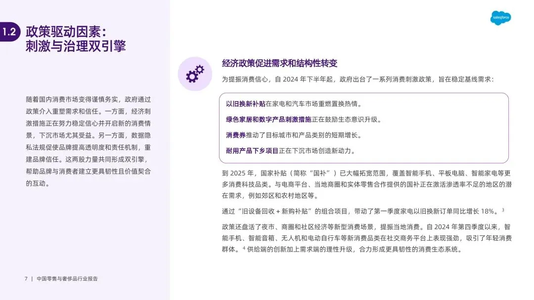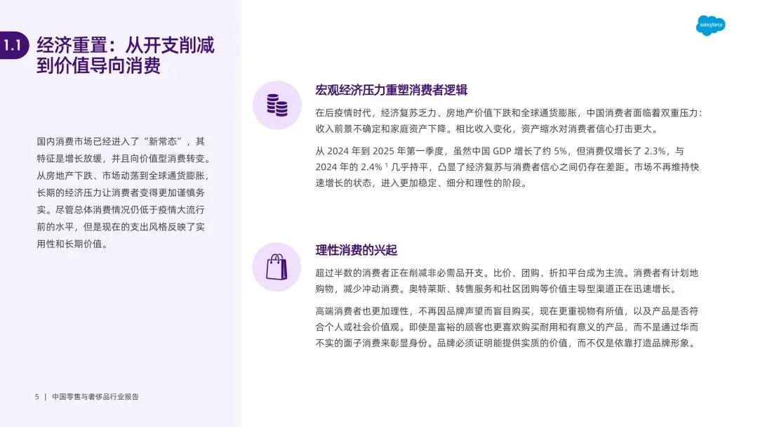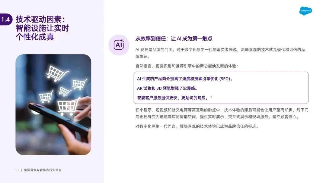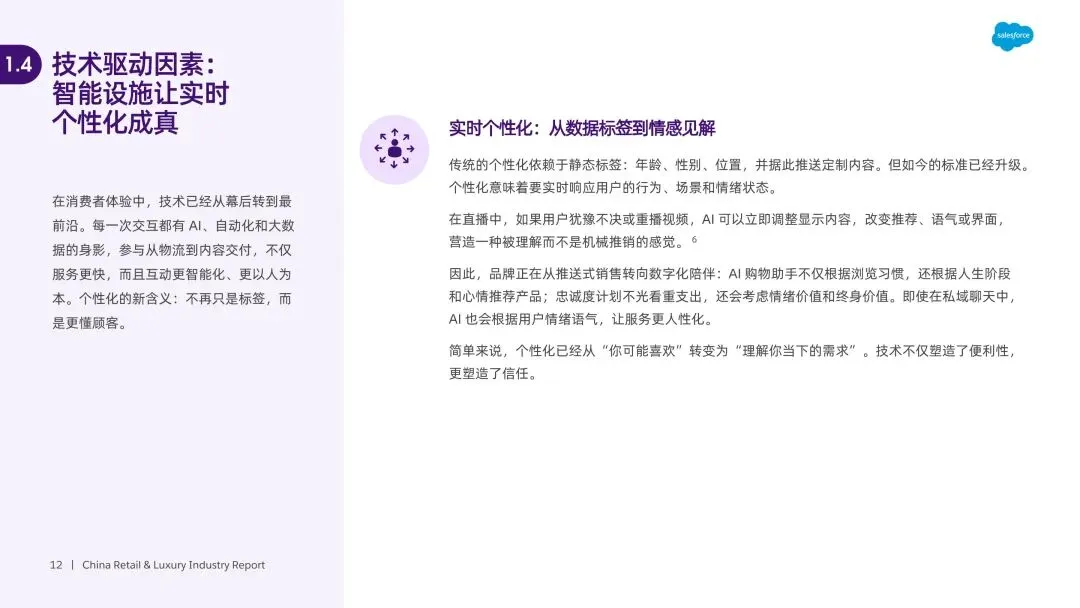 消费逻辑重构,理性与情感需求双重驱动。宏观经济压力下,消费者转向价值导向消费,超半数削减非必需品开支,比价、团购成主流。同时,Z 世代和千禧一代将消费作为身份表达与情感联结方式,情绪价值成为日常购买决策关键,护肤品、零食等品类通过感官体验、怀旧叙事传递情感慰藉,线下门店升级为情感关怀空间。 AI 成为核心增长引擎,重塑全价值链。93% 企业计划加码 AI,其应用贯穿制造、供应链、营销、客户服务全环节。智能服务助理解决 85% 日常查询,实时个性化推荐助力美妆平台转化率提升 40%;生成式 AI 实现大规模内容创作与广告优化,某快消品牌借助 AI 精准定位受众,点击率增长 3 倍。AI 还通过库存预测、客流模拟等实现预判决策,打通多渠道数据形成协同体验。 即时零售生态成熟,从速度竞争转向情感共鸣。2023 年即时零售市场规模达 6500 亿元,预计 2030 年超 2 万亿元,“一小时送达” 成为刚需。渠道端形成 “前置仓 + 社区商店 + 众包骑手” 的超本地化网络,2023 年闪电仓库订单增长 54%。竞争核心从物流速度转向场景契合与情绪满足,品牌通过 “内容 + 场景 + 即时履约” 模式,将深夜零食、节日送礼等情绪需求转化为消费行为。 全渠道运营遇阻,碎片化与系统割裂成主要瓶颈。多数品牌存在系统孤立、跨部门协同不力问题,导致线上线下价格不一致、会员数据不通联,60% 用户厌倦重复包装内容。全渠道管理从竞争优势沦为基础需求,但后端系统过时、数据整合能力不足,使得品牌难以建立 360 度客户视图,70% 品牌无法将会员数据与员工服务记录关联,影响个性化体验落地。 品牌增长依赖关系构建,三大战略破解增长难题。品牌需先搭建互联运营体系,打通小程序、POS、CRM 等核心平台,实现产品信息、服务标准一致;再通过长期内容策略与一线员工赋能,让每个触点创造价值,将品牌价值与实用内容结合;最后聚焦客户生命周期管理,按阶段定制互动,将忠诚度计划升级为社区,通过奖励互动、举办线上线下活动,建立长期情感联结。