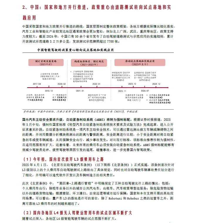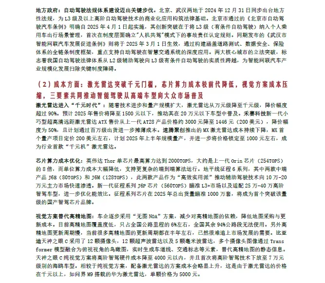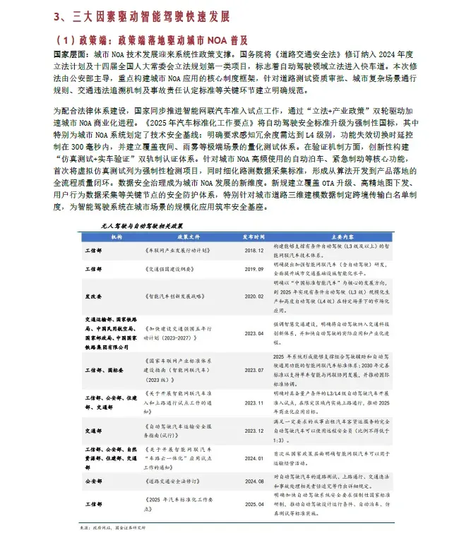 当前,中国智能驾驶产业正迈入规模化普及与高阶突破并举的关键阶段。政策层面,L3 级自动驾驶在2025 年迎来重要的准入破冰,相关法律法规持续完善,为高阶智驾的商业化落地铺平道路。市场层面,在比亚迪、吉利等主流车企大力推行的“智驾平权”战略驱动下,高速NOA、城市NOA 等L2+级功能正加速从高端配置向15 万乃至10 万元以下的主流市场渗透,带动L2 及以上级别辅助驾驶的渗透率持续攀升。与此同时,产业竞争焦点正从单一功能竞逐,转向以“车路云一体化”为核心的技术生态整合,安全与标准化成为行业健康发展的基石。在政策、技术与市场的三重驱动下,智能驾驶产业生态日益成熟,相关厂商将在规模化和技术迭代中迎来新的发展机遇。