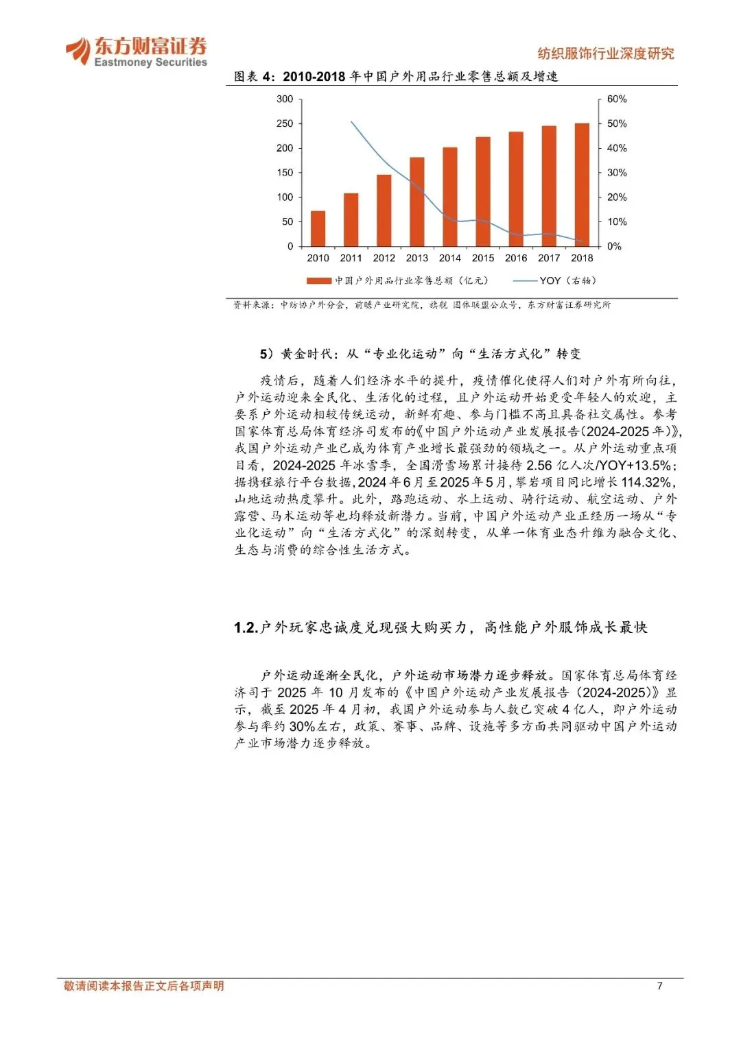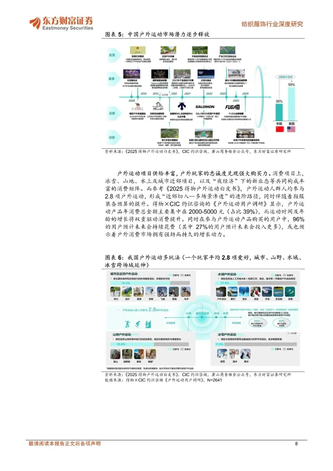 参考国家体育总局发布的报告,我国户外运动产业已成为体育产业增长最强劲的领域之一,截至 2025 年 4 月初,我国户外运动参与人数已突破 4 亿人,即户外运动参与率约 30%。消费项目上,冰雪、山地、水上及城市近郊项目,以及“夜经济”下的新业态等共同构成丰富的消费矩阵,户外玩家的忠诚度兑现强大购买力。