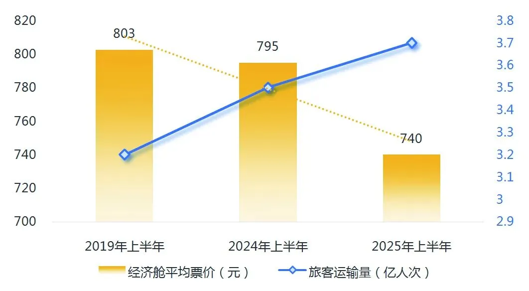 根据航班管家公布数据,2025上半年全民航旅客运输量达3.7亿人次,同比增长5.9%,民航整体客座率达84.1%,同比增长1.9%,但国内经济舱平均票价仅为740元,同比下降6.9%。具体如图1所示。