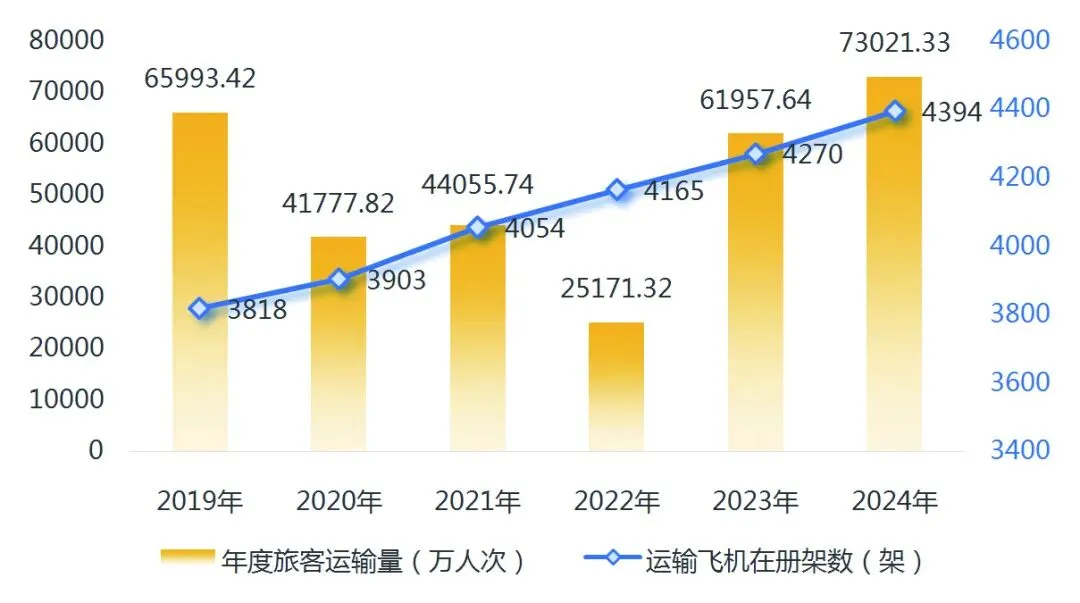 当前,行业基本面出现了一定程度的供需失衡。2019年至2024年间,行业运输飞机在册架数从3853架稳步增长至4394架,增幅达14.0%,运力供给明显增加。然而,同期的旅客运输量却经历了大幅波动,同期旅客运输量增幅仅10.6%,落后于运力增幅,具体如图3所示。同时,国际航线的恢复进度显著滞后于国内市场,也是供需失衡的重要诱因。截至2024年,国际航线客运量仍未完全恢复至疫情前水平,导致原本计划投入国际远程航线的大型宽体客机被迫“回流”至国内市场,进一步加剧了国内运力过剩的局面。此外,宏观预期转弱也制约了航空需求的反弹力度,消费者出行决策更趋谨慎,价格敏感度升高,使得市场需求弹性不断增大。
