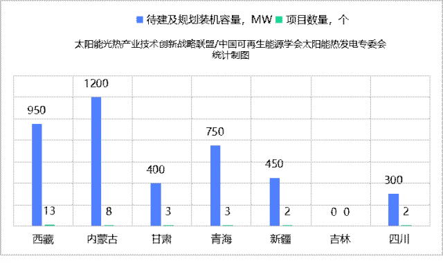 在各省区光热电站建设情况方面,太阳能光热产业技术创新战略联盟/中国可再生能源学会太阳能热发电专委会统计,截至2025年,甘肃省累计装机规模最大(621MW,含兰州大成1MW屋顶线菲式光热发电系统),青海省次之(510MW),新疆位居第三(450MW)。在建的光热发电项目方面,青海省在建光热发电装机规模最大,达到1350MW;新疆次之(1050MW);西藏位居第三(250MW)。太阳能光热产业技术创新战略联盟/中国可再生能源学会太阳能热发电专委会根据公布的信息以及初步核实发现,内蒙古、西藏和青海宣布待建和规划的光热发电装机容量位居前列,总计约3000MW。