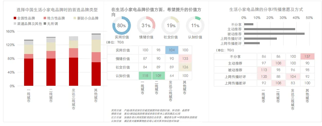 从城市梯级来看,一线城市消费者对生活小家电品牌重视度一般,更偏好在固定的几个品牌中筛选,虽认可中国品牌,但溢价意愿不高。他们聚焦于全国性大品牌,注重品牌带来的认知层面加分,有人询问时会被动推荐,但主动分享意愿不强。发达三线城市消费者则展现出较高的品牌忠诚度,更偏好盯着一个品牌购买,溢价意愿较高,且更关注实用价值,若产品体验良好,愿意在网上主动传播分享,成为品牌的 “民间代言人”。二线及其他三线城市消费者则介于两者之间,性价比是核心决策因素,对新锐品牌的接受度逐步提升。
