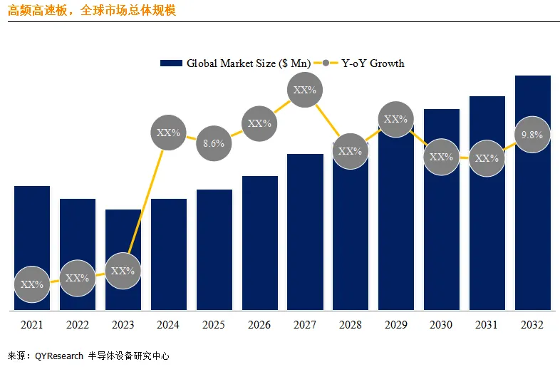 据QYResearch调研团队最新报告“全球高频高速板市场报告2026-2032”显示,预计2032年全球高频高速板市场规模将达到7,603百万美元,未来几年年复合增长率CAGR为9.7%。