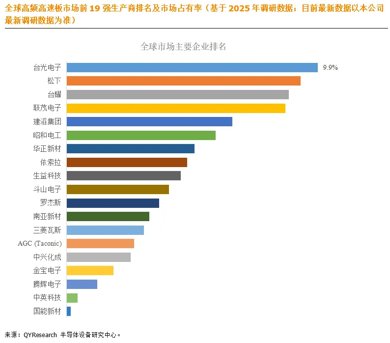 根据QYResearch头部企业研究中心调研,全球范围内高频高速板生产商主要包括台光电子、松下、台耀、联茂电子、建滔集团、昭和电工、华正新材、依索拉、生益科技和斗山电子等。2025年,全球前十强厂商占有大约63%的市场份额。
