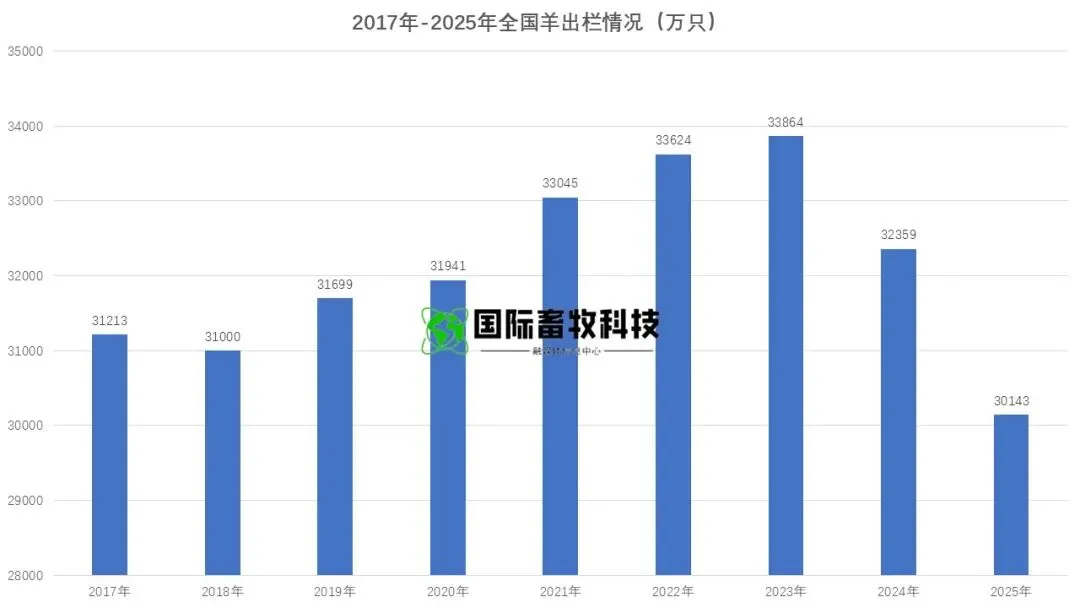 2025年,全国羊出栏量呈现显著收缩态势,全年出栏30143万只,较上年减少2215万只,降幅达6.8%,这是自2024年以来连续第二年下滑,且出栏规模首次降至3.1亿只以下,为近9年最低水平。