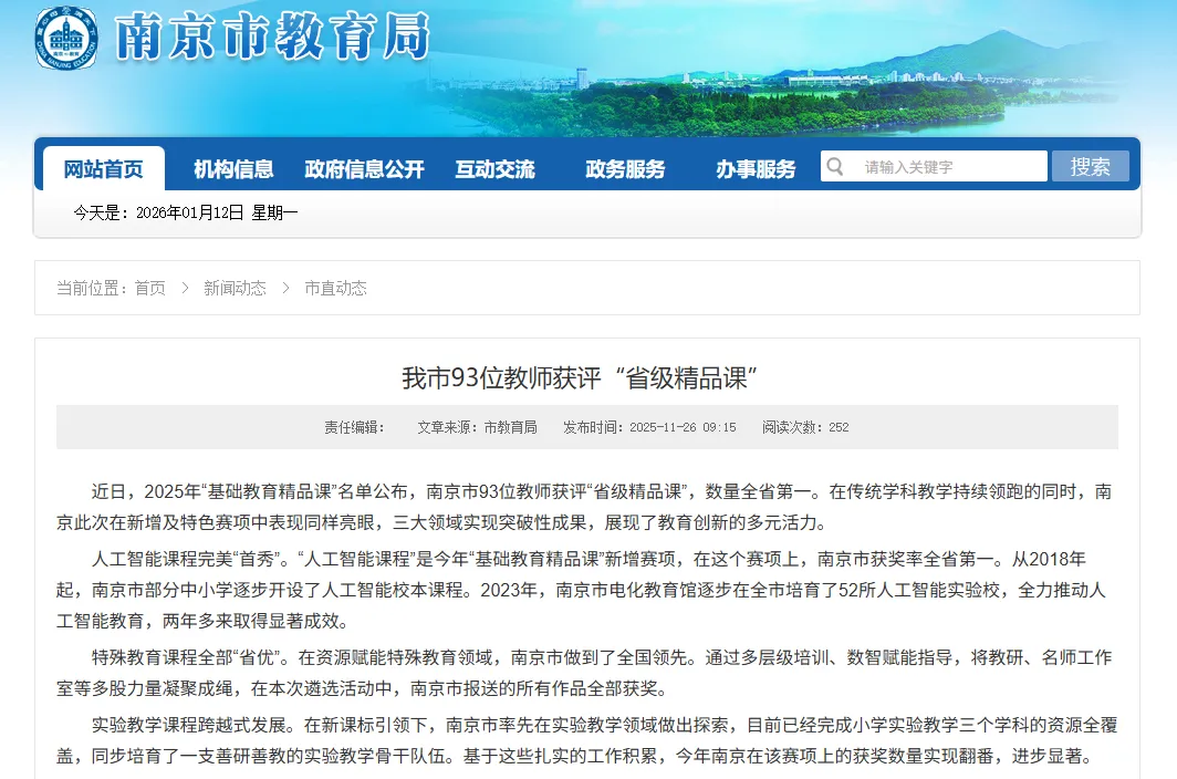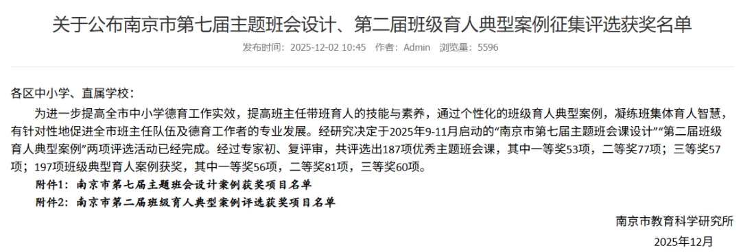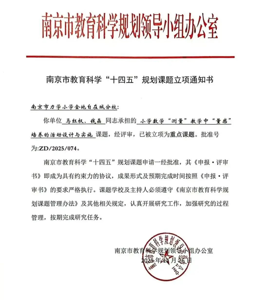学校“科研兴校”战略全面落地,教师科研参与面广、成果丰硕。全年共有50余篇论文获奖或发表,15项省市级课题成功立项、结题。其中,马红权、钱晶老师的课题《小学数学“测量”教学中“量感”培养的活动设计与实施》被列为南京市2025年度教育科学重点规划课题,王倩老师的论文《问思融创:生成式AI赋能实用性阅读单元教学》获2025年南京市优秀教育论文评比一等奖。