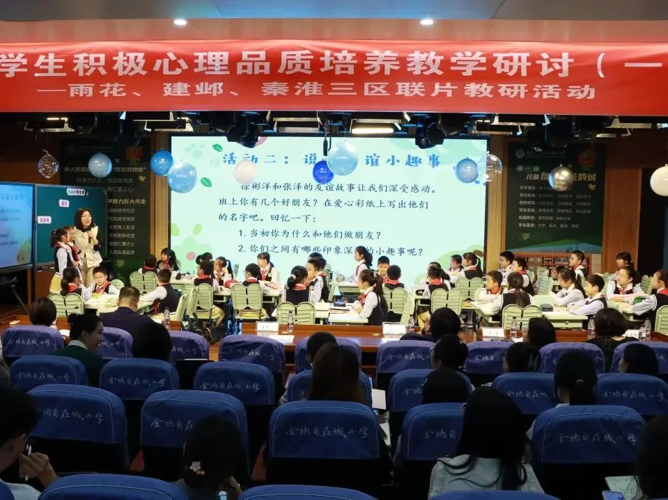 力小金地教师“力耕课堂”的热情持续高涨,两校区成为区域教研交流的重要平台。全年承办市级教研现场3次,分别是“三区联动共研育人路 积极心理赋能成长行——南京市小学心理健康教育教研展示活动”“新课标 新课堂 新教学——南京市金地自在城小学承办市级小学语文‘金陵好课堂’研讨活动”“新型优质小班制教学实践之‘学为中心’理念下进阶式学习活动的研究”;承办区级教研现场27次,共有57名教师在省市区教研现场开办讲座、展示优质课。