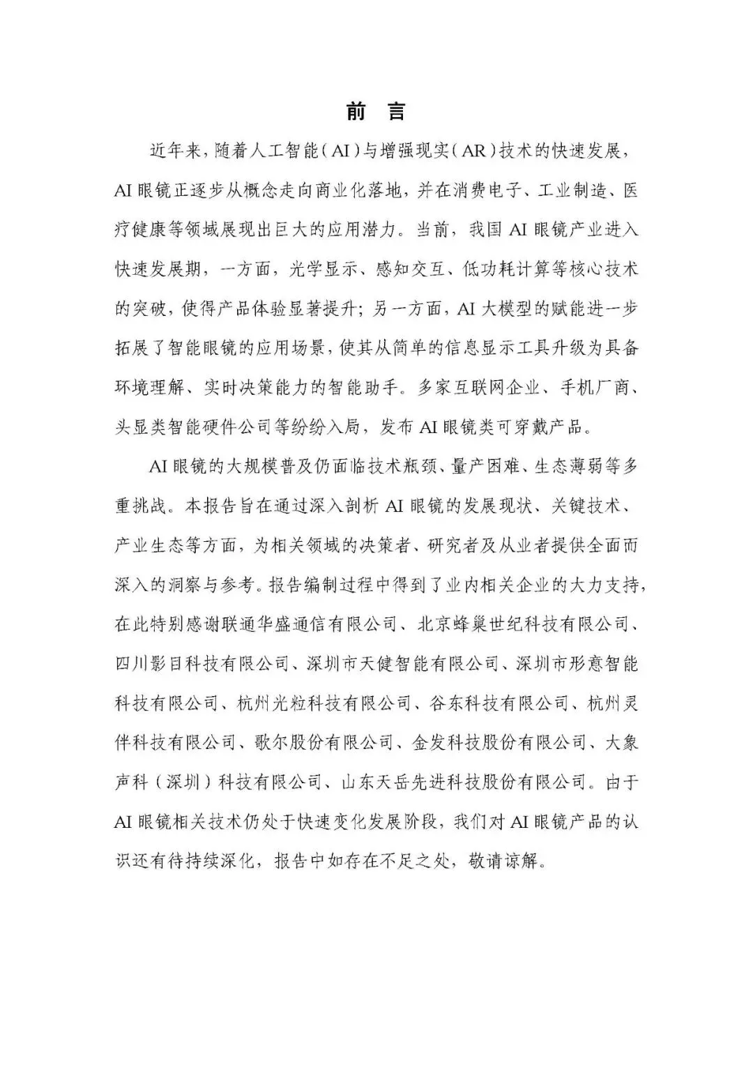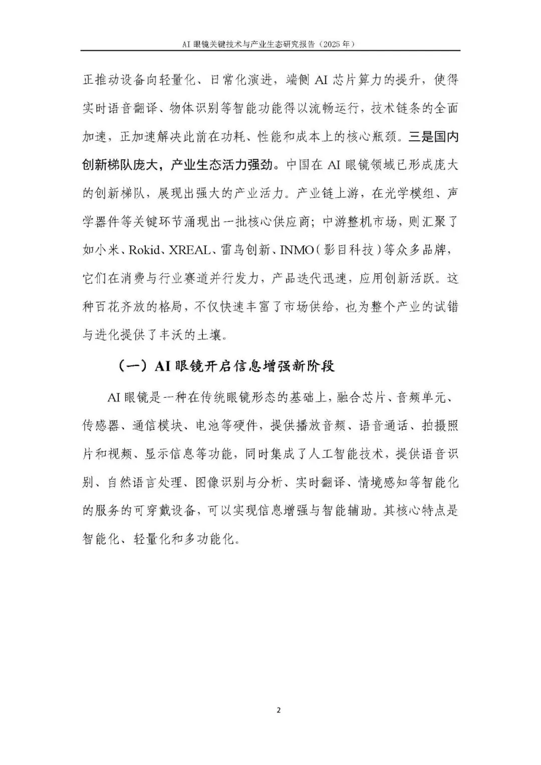 AI 眼镜作为融合 AI 与 AR 技术的可穿戴设备,正从概念验证迈向商业化落地关键期,成为智能穿戴领域核心增长点。全球智能穿戴设备市场规模稳健扩张,2024 年达 721 亿美元,预计 2034 年将突破 4000 亿美元,其中 AI 眼镜凭借多模态感知能力脱颖而出。当前行业呈现三大特征:一是典型产品涌现,2024 年 RayBan 智能眼镜出货超 100 万台,2025 年全球预计出货 1280 万台(中国 275 万台,同比增长 107%);二是技术持续成熟,光学显示、端侧 AI 等突破缓解功耗与成本瓶颈;三是国内产业生态活跃,形成涵盖上游核心部件、中游整机制造、下游应用开发的完整创新梯队。