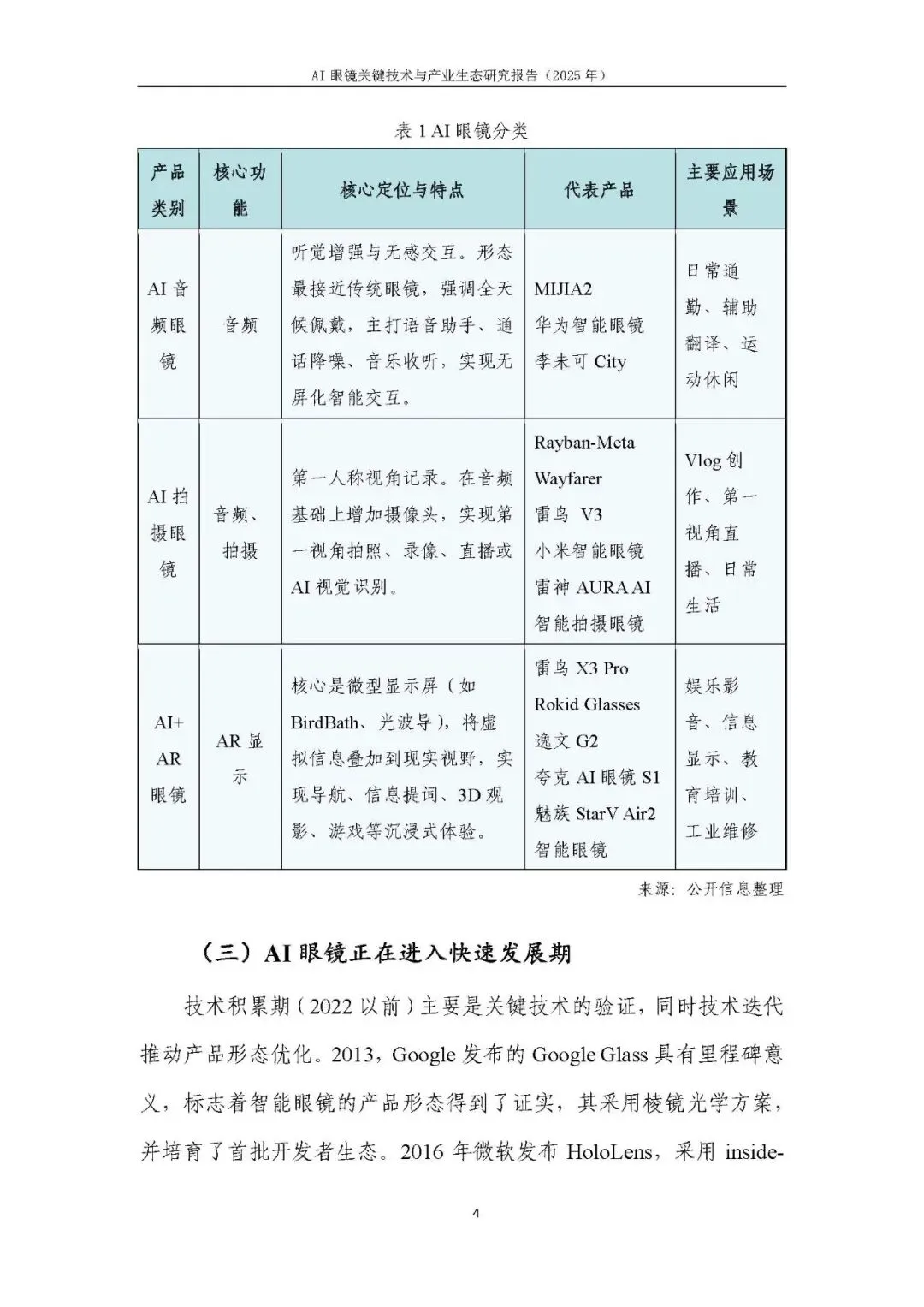 产品分为三类:AI 音频眼镜(主打语音交互与全天候佩戴)、AI 拍摄眼镜(第一视角记录与视觉识别)、AI+AR 眼镜(虚拟信息叠加与沉浸式体验),分别适配日常通勤、内容创作、娱乐教育等多元场景。发展历程历经技术积累期(2022 年前,关键技术验证)、快速发展期(2023-2026,AI 大模型融合催生消费级爆发),未来将迈向市场成熟期(2027 年后,技术标准化与大众普及)。