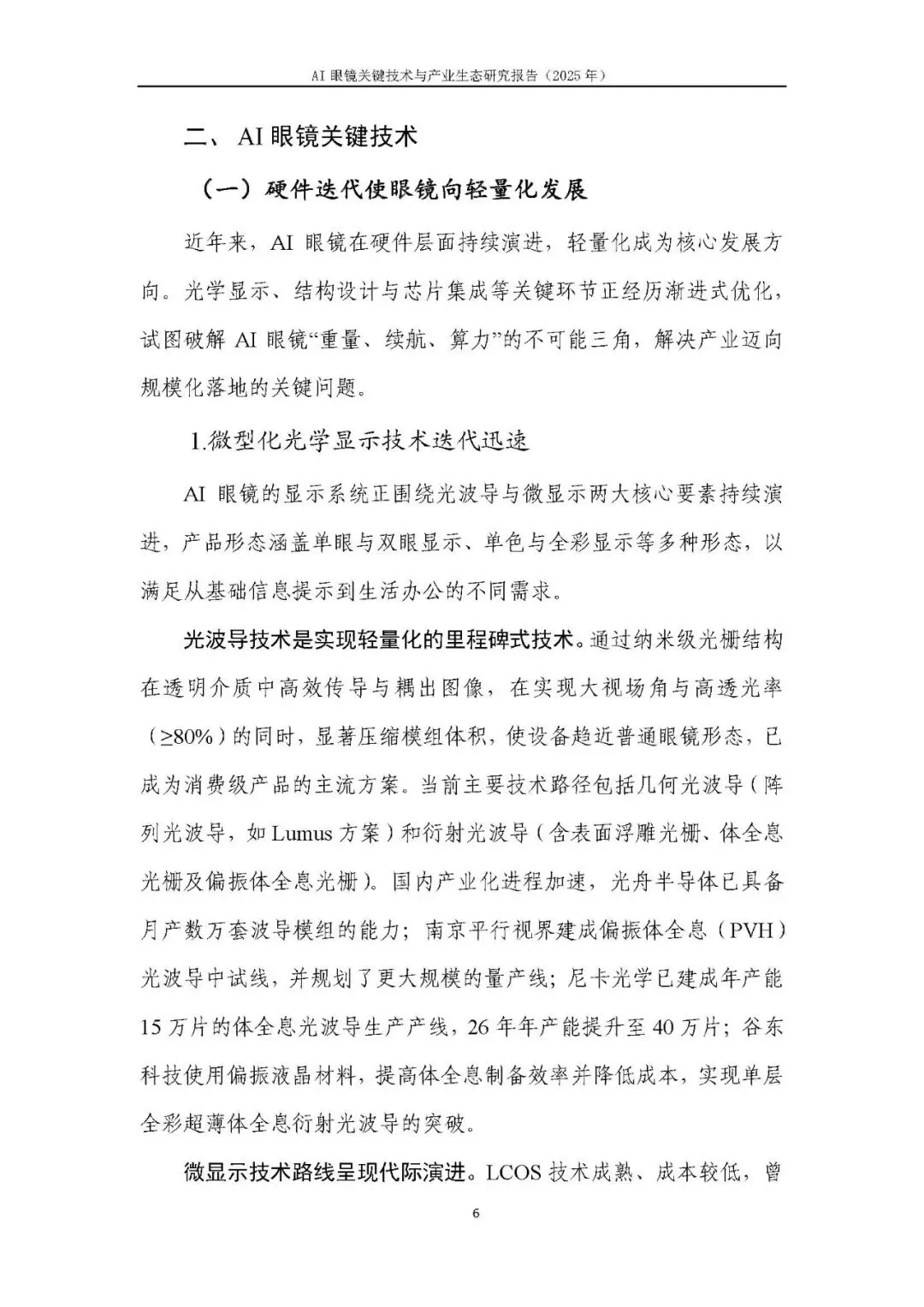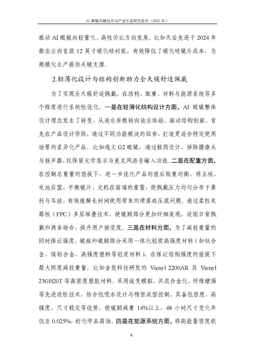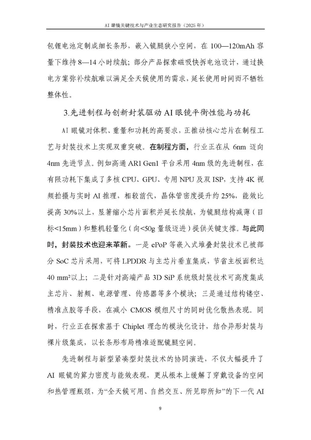 轻量化是核心方向,光学显示上,光波导技术(几何与衍射路线)实现高透光率(≥80%)与小型化,MicroLED 成为下一代主流微显示方案,碳化硅材料优化视场角与散热;结构设计通过配重均衡、轻质材料(钛合金、改性塑胶)、柔性电路板等实现舒适佩戴;芯片采用 4nm 先进制程与 ePoP/3D SiP 封装技术,平衡算力、功耗与体积,目标整机重量<50g。