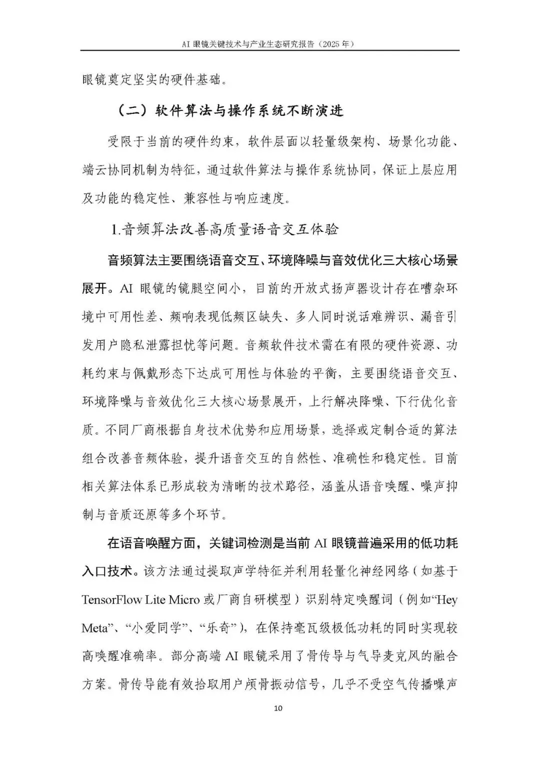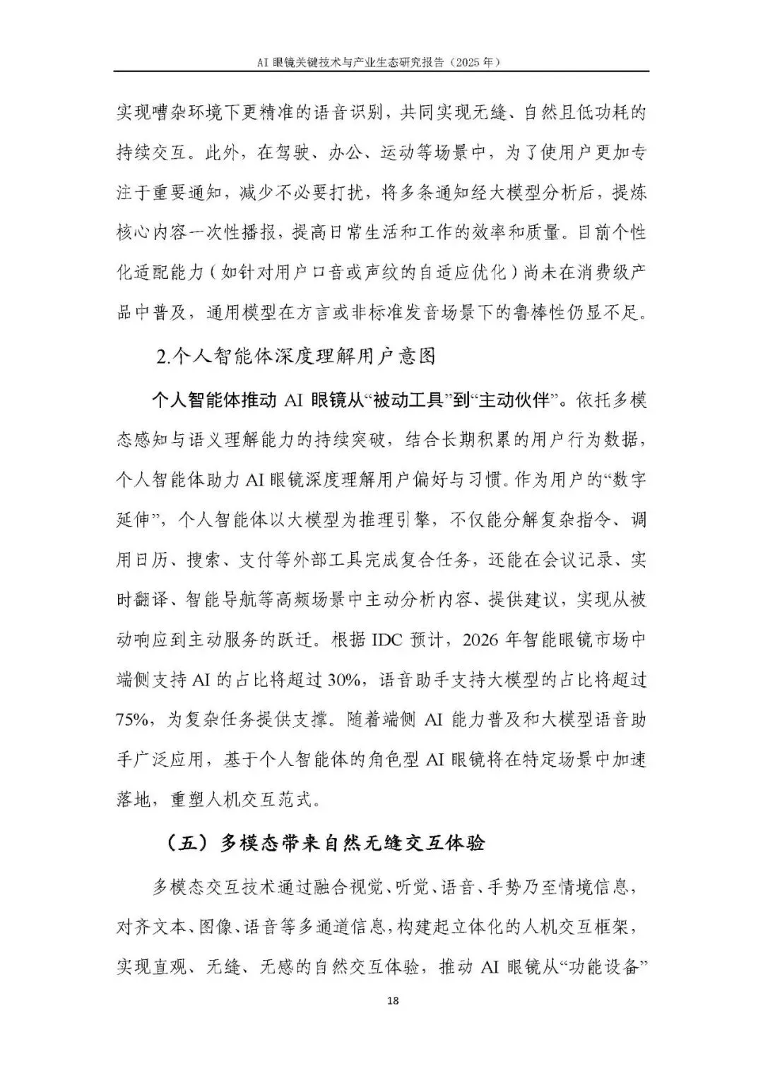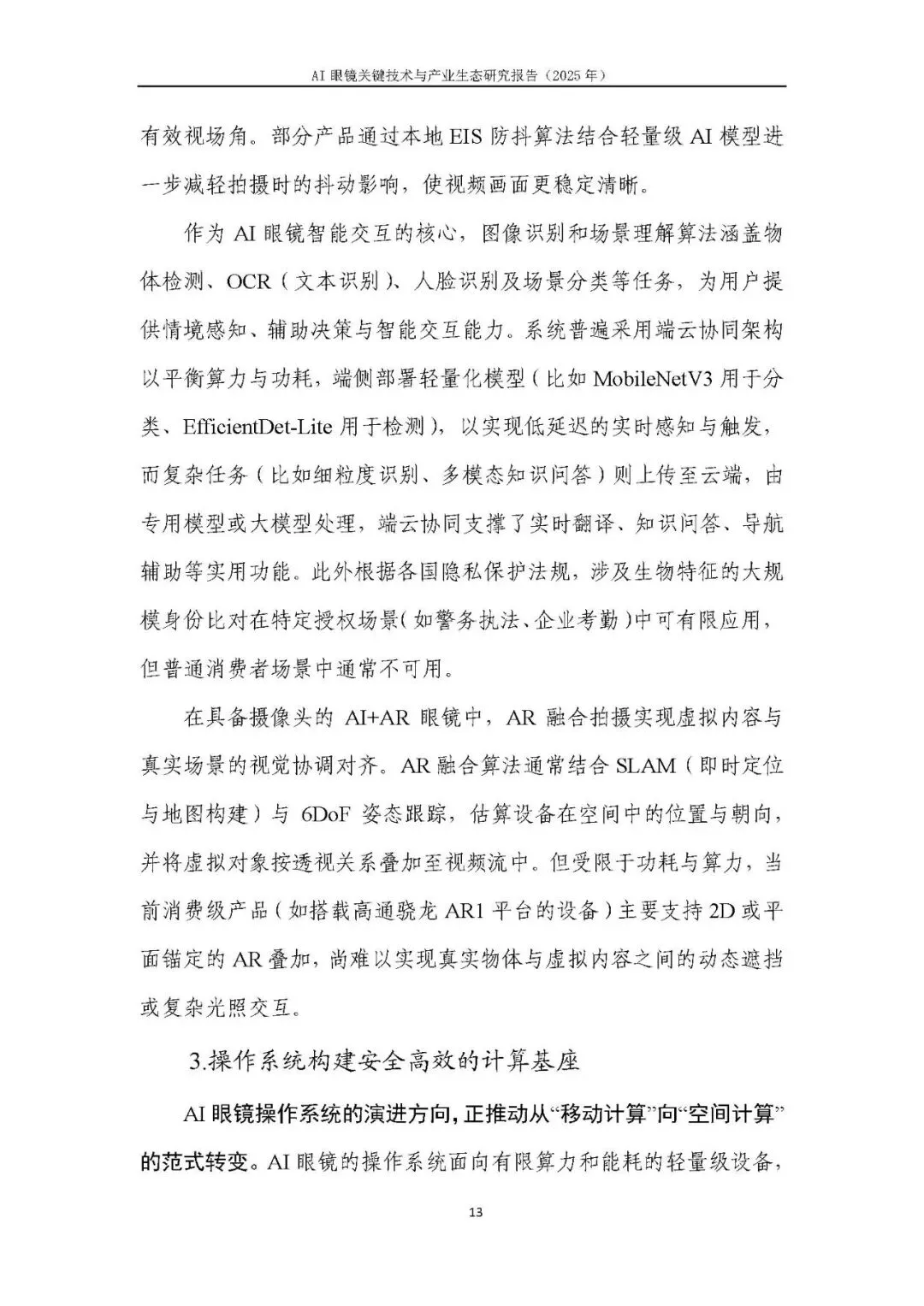 音频算法通过多麦克风融合、降噪与音效优化提升语音交互体验;图像算法借助多帧融合、EIS 防抖等改善成像质量,端云协同支撑 OCR 翻译等智能功能;操作系统向空间计算演进,Android XR 等平台实现多设备兼容与 AI 能力集成;大模型赋能让设备具备自然对话、知识推理与主动服务能力,个人智能体推动从 “被动工具” 到 “主动伙伴” 升级;多模态交互融合视觉、听觉等信号,构建无缝人机交互框架。
