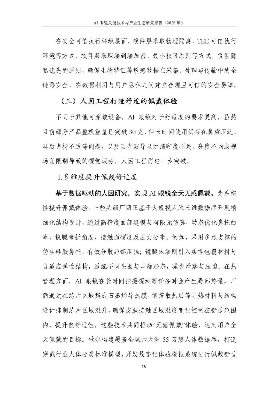 监管与创新平衡:鼓励 “AI 眼镜 + 行业” 场景融合,通过跨界合作促进应用孵化;强化隐私保护(强制拍摄提示、端侧数据处理),建立全生命周期安全认证体系,防范数据安全风险。