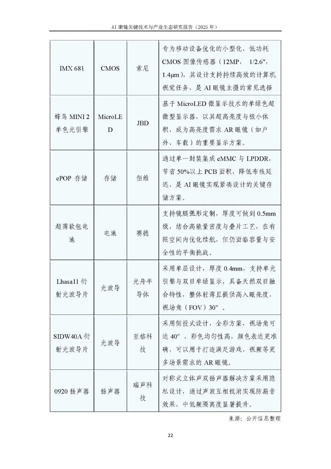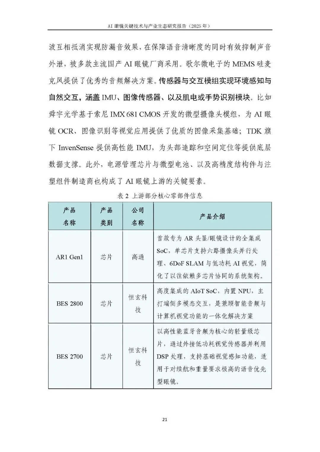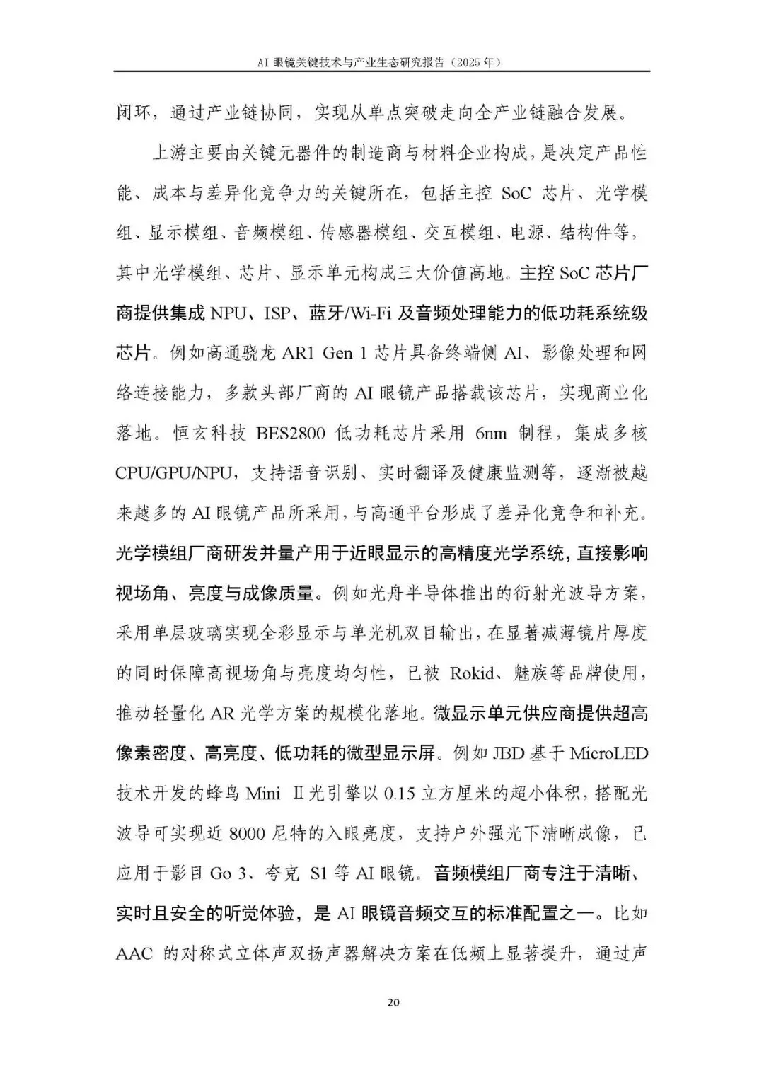 上游以芯片(高通 AR1、恒玄 BES2800)、光学模组(光舟半导体光波导)、微显示(JBD MicroLED)为核心价值高地;中游汇聚歌尔股份等代工厂与华为、小米、Rokid 等品牌厂商;下游覆盖消费与行业场景,应用开发商积极探索导航、支付等适配功能。国内在整机设计与应用开发具备优势,但高性能芯片等核心部件仍依赖海外供应。