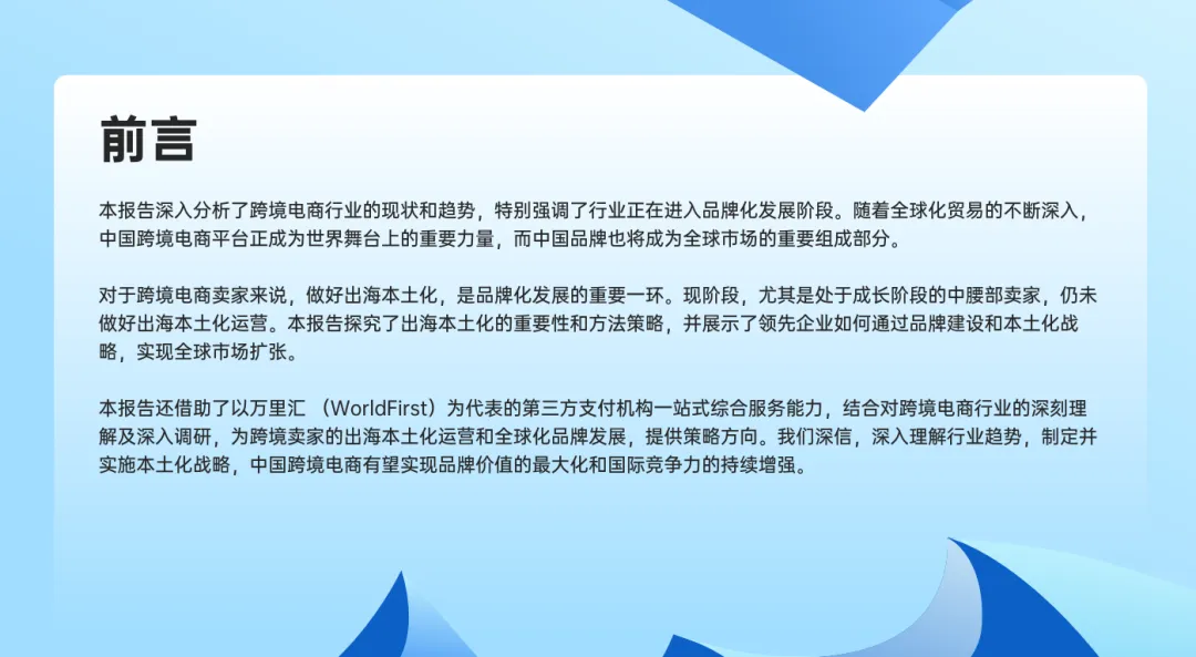 指出,跨境电商已进入精耕细作阶段,品牌化是大势所趋,而本土化是品牌化的核心。涵盖品类聚焦、高潜区域布局、多元渠道拓展等本土化策略,搭配成功案例与合规解决方案。