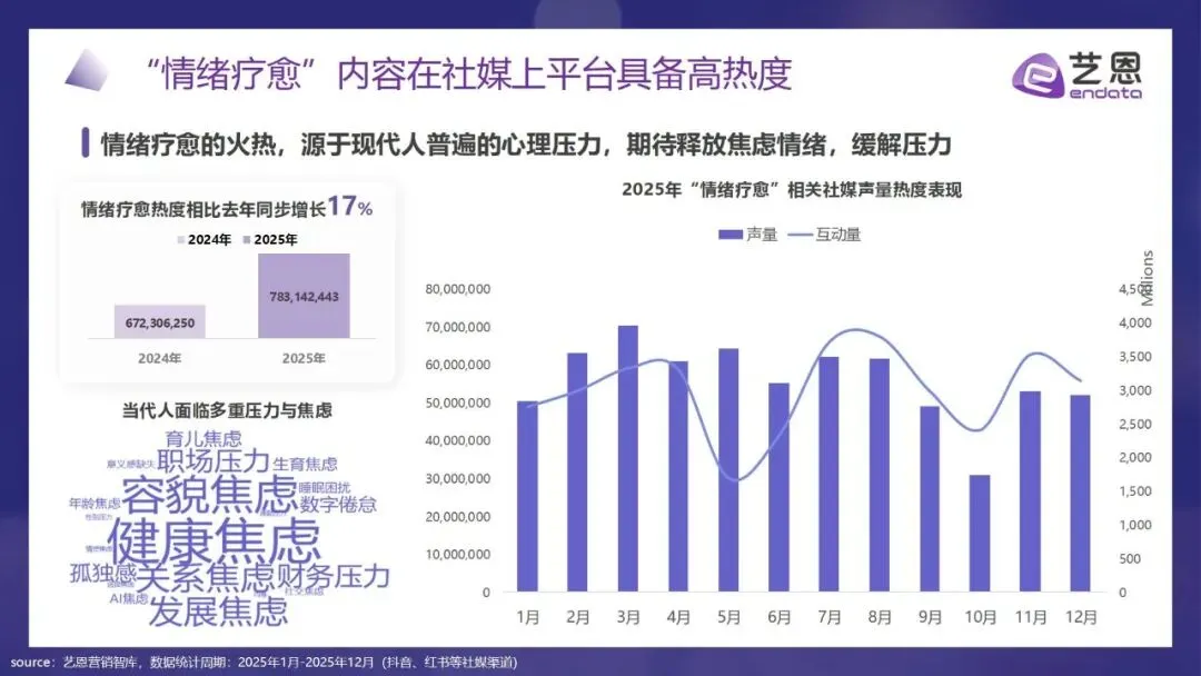 在快节奏、高压力的当代社会,情绪问题已成为普遍性时代症候,人们从取悦他人转向关爱自我,情绪疗愈从边缘话题跃升为消费新引擎,渗透日常生活各场景。社媒数据显示,2025年情绪疗愈相关声量与互动量持续走高,热度同比增长17%,背后是现代人对缓解焦虑、孤独等多重情绪困扰的迫切需求。情绪疗愈经济作为以身心平衡为核心的新型经济形态,年复合增长率达25.6%,涵盖实物、体验、数字等多元消费品类,形成感官沉浸、情感联结的新消费形态,并向各行业延伸出“疗愈+”场景。报告基于社媒大数据与消费行为洞察,梳理三大核心人群特征与诉求,为理解这一新兴市场提供核心参考。