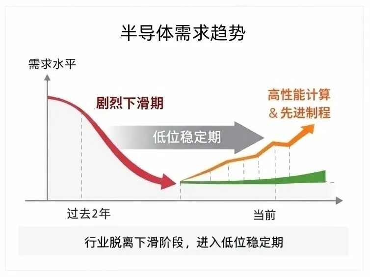 消费电子砍单、服务器订单波动、汽车芯片需求反复。台积电财报显示,行业最剧烈的下滑已经过去,整体市场进入低位稳定期。