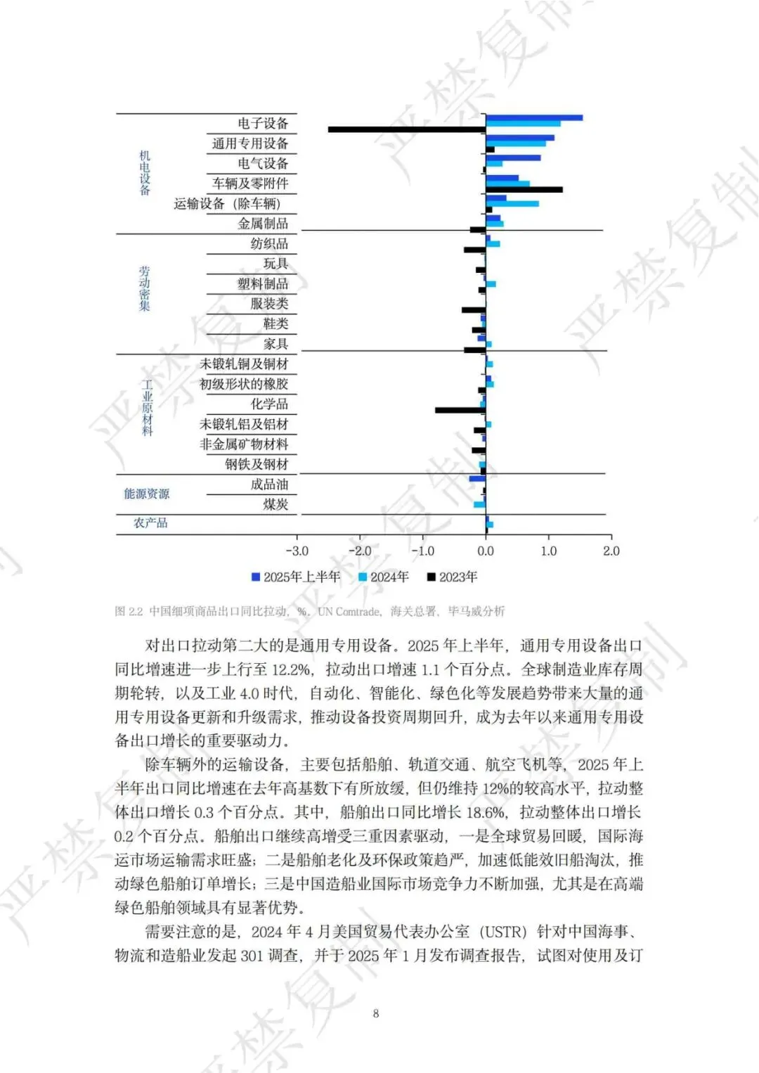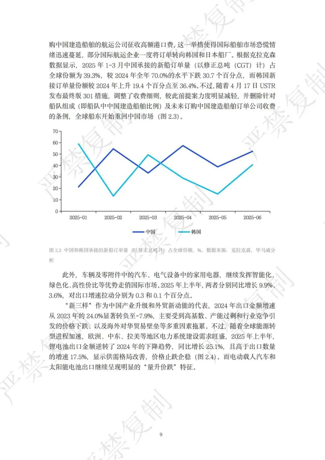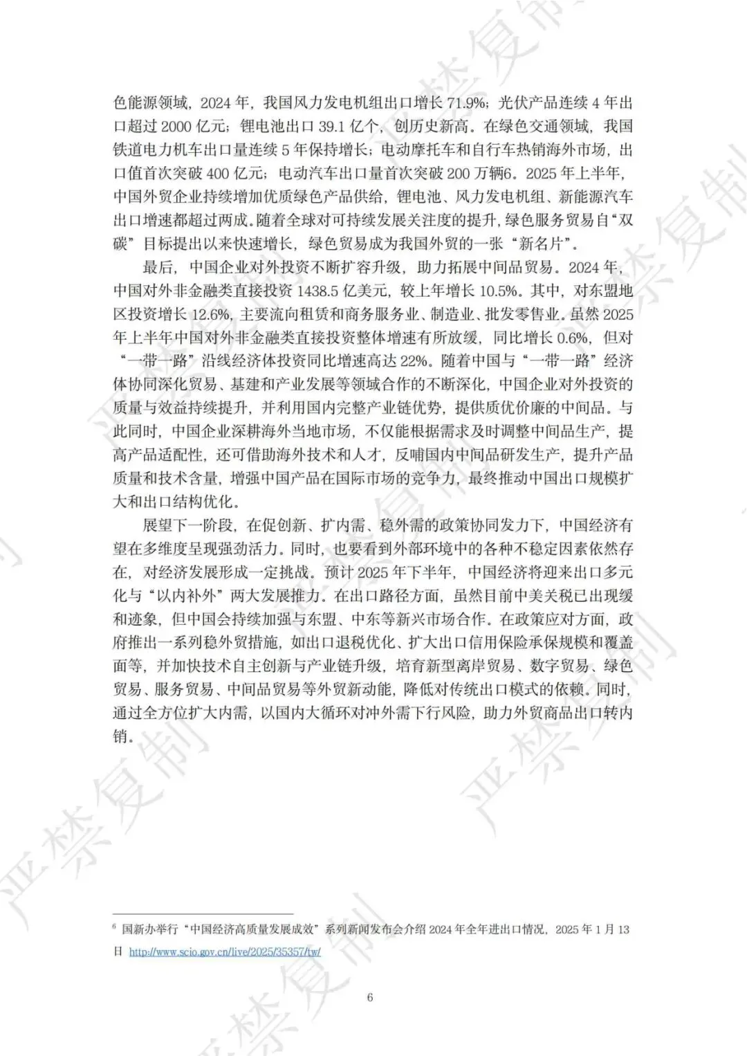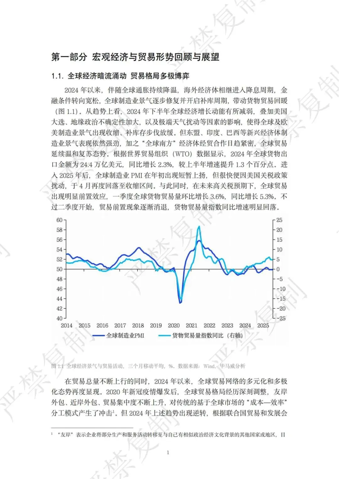 2024年以来,伴随全球通胀持续降温,海外经济体相继进入降息周期,金融条件转向宽松,全球制造业景气逐步修复并开启补库周期,带动货物贸易回暖。从趋势上看,2024年下半年全球经济增长动能有所减弱,叠加美国大选、地缘政治不确定性加大,以及极端天气扰动等因素的影响,使得全球及欧美制造业景气出现收缩、补库存步伐放缓。但东盟、印度、巴西等新兴经济体制造业景气表现依然强劲,加之“全球南方”经济体经贸合作日趋紧密,全球贸易延续温和复苏态势。根据世界贸易组织(WTO)数据显示,2024年全球货物出口金额为24.4万亿美元,同比增长2.3%,较上半年增速提升1.3个百分点。进入2025年后,全球制造业PMI在年初出现短暂上扬,但很快便因美国关税政策扰动,于4月再度回落至收缩区间。与此同时,在未来高关税预期下,全球贸易出现明显前置效应,一季度全球货物贸易量环比增长3.6%,同比增长5.3%。不过二季度开始,贸易前置现象逐渐消退,货物贸易量指数同比增速明显回落。