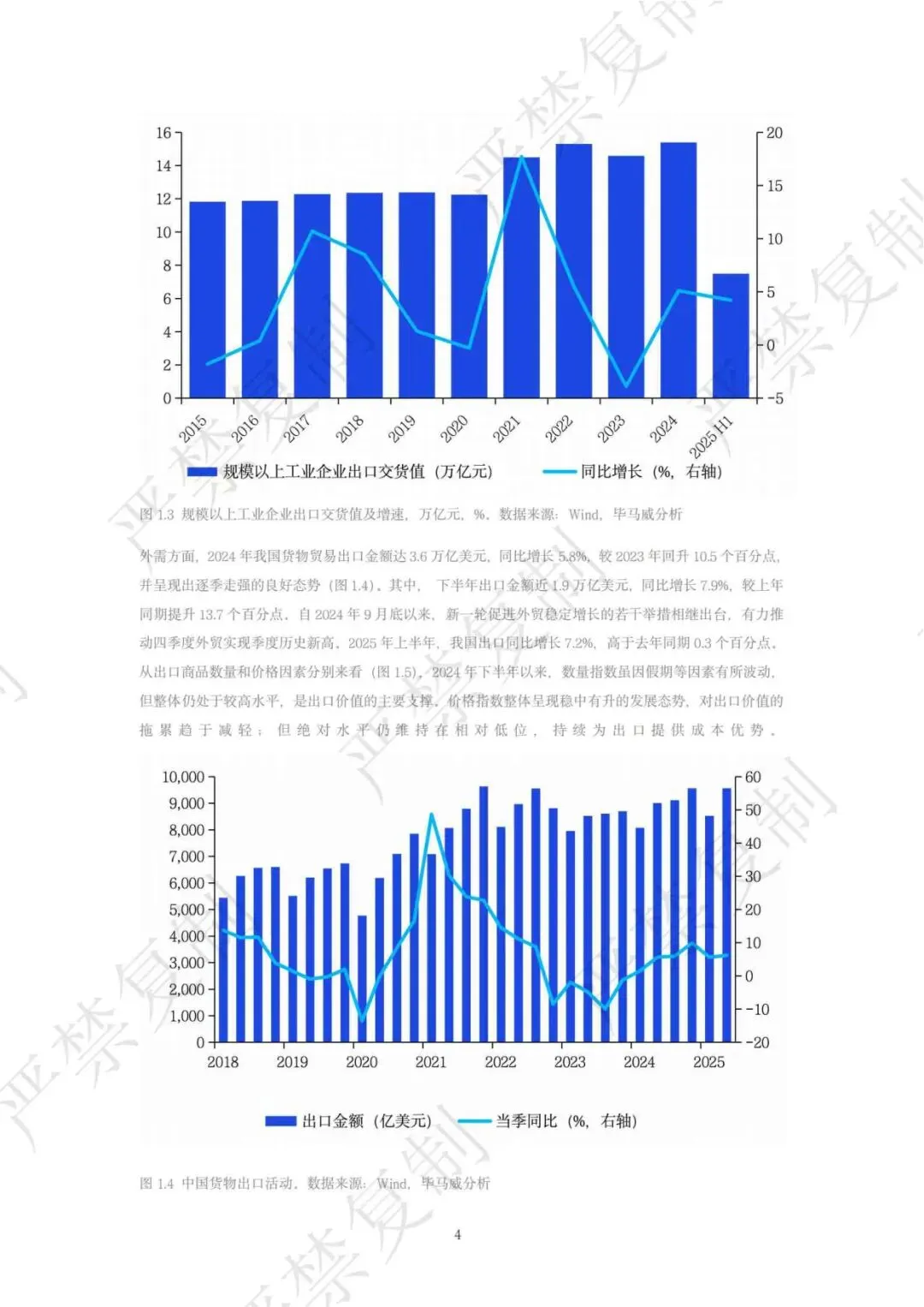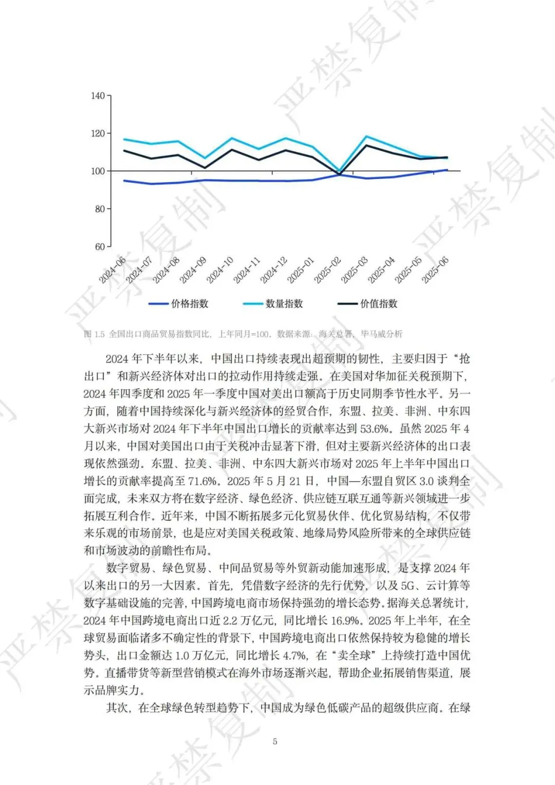 外需方面,2024年我国货物贸易出口金额达3.6万亿美元,同比增长5.8%,较2023年回升10.5个百分点,并呈现出逐季走强的良好态势。其中,下半年出口金额近1.9万亿美元,同比增长7.9%,较上年同期提升13.7个百分点。自2024年9月底以来,新一轮促进外贸稳定增长的若干举措相继出台,有力推动四季度外贸实现季度历史新高。2025年上半年,我国出口同比增长7.2%,高于去年同期0.3个百分点。从出口商品数量和价格因素分别来看,2024年下半年以来,数量指数虽因假期等因素有所波动,但整体仍处于较高水平,是出口价值的主要支撑。价格指数整体呈现稳中有升的发展态势,对出口价值的拖累趋于减轻;但绝对水平仍维持在相对低位,持续为出口提供成本优势。