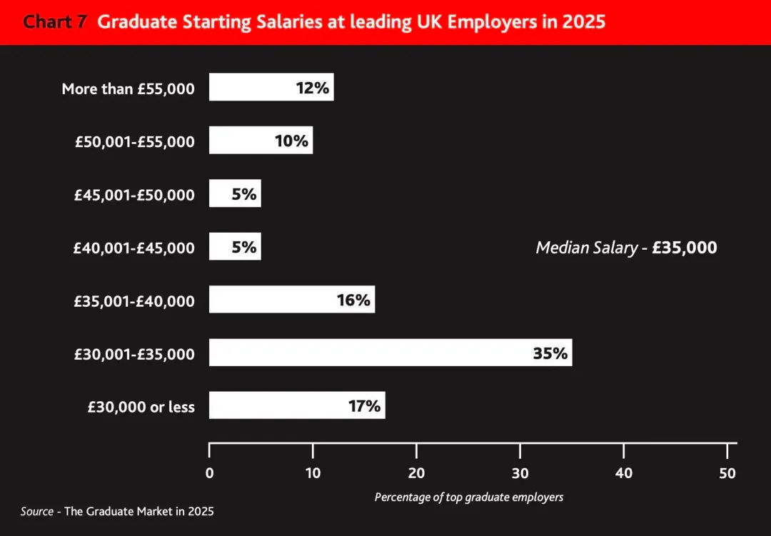 2025年,毕业生的起薪中位数达到35,000英镑,较2024年上涨1,000英镑,其中,有12%的顶级雇主提供超过55,000英镑的高起薪。