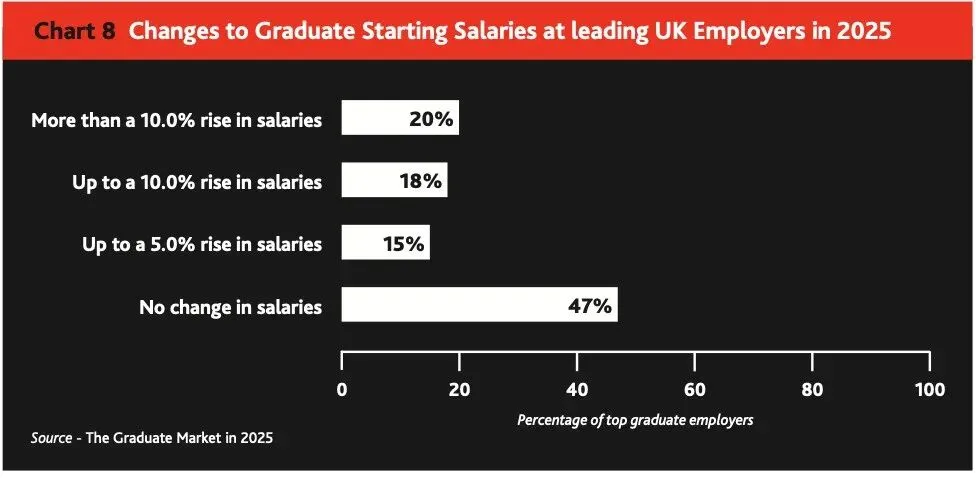 在毕业生起薪调整幅度方面,47% 雇主2025年对起薪设置无变化,20% 调薪超过 10%,18% 调薪 5%-10%,15% 调薪 0-5%;12% 雇主提供超 55,000 英镑起薪,17% 雇主起薪不高于 30,000 英镑。