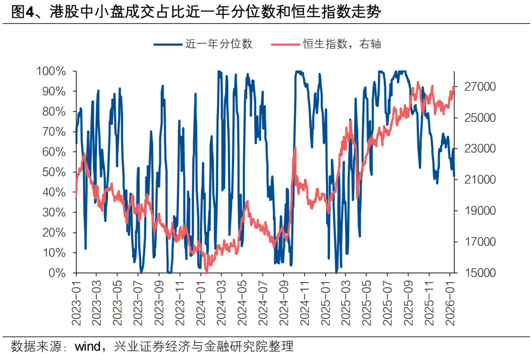 量能是市场情绪最直观的体现,最为常用的指标之一是换手率。换手率代表转手买卖股票的频率,是观察量能变化、衡量情绪热度的重要观察指标,和港股走势相关。我们对恒指换手率计算其近1年分位数,发现该指标对市场阶段性拐点有较好的指示效果。2.中小盘成交占比
