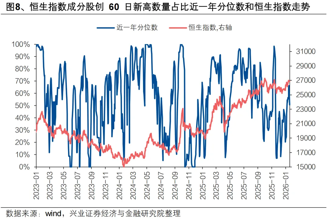 成交额也是量能维度中的观测市场情绪的重要指标之一,但由于在市场显著调整(情绪恐慌阶段),成交额也大概率放量,因此我们选用中小盘成交占比这一相对指标来刻画市场情绪,该指标自16年以来和恒指相关性超0.4。一方面,相比于绩优的大盘龙头股,投资者对中小盘股的参与度变化更能刻画市场情绪波动。另一方面,即便在市场情绪恐慌阶段中,港股整体成交有所放量,但由于港股市场的流动性特征,大盘股的成交增长会更明显,因此中小盘成交占比也会出现明显回落(例如25年4月7日)。我们对中小盘成交占比计算其近1年分位数,发现该指标对股价阶段性拐点有较好的指示效果。