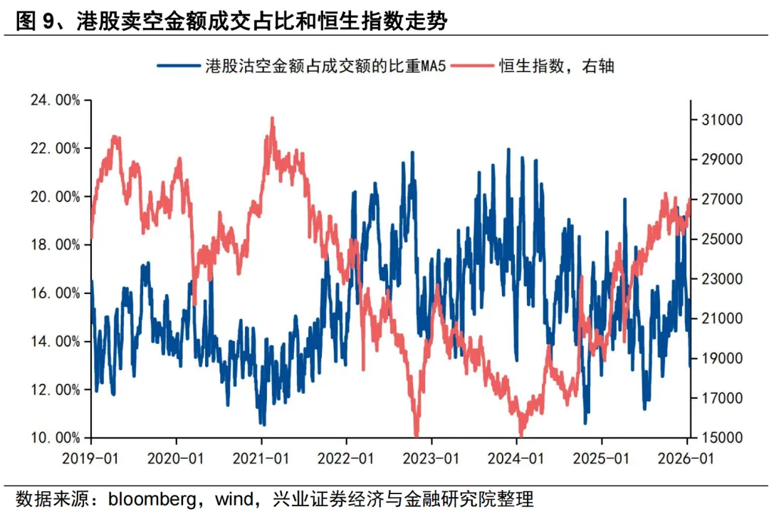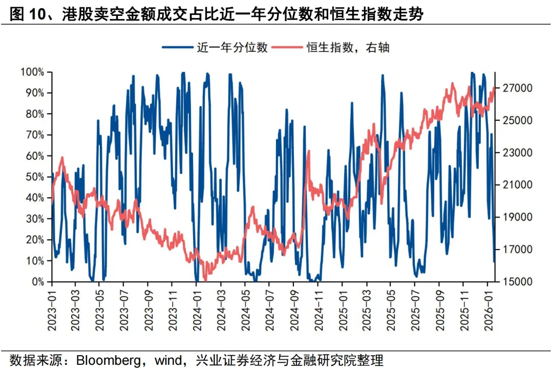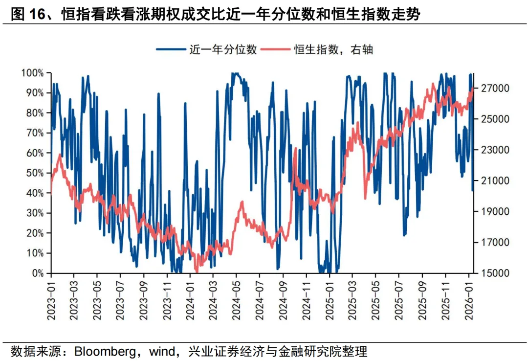 值得一提的是,尽管25年以来南下成交占比出现显著提升,但由于其背后的投资者成分较为复杂且较难识别和拆分,如保险等中长期资金的流入流出和短期情绪波动的相关性较低,甚至会出现“越跌越买”的反向信号(例如25年4月3日至7日南下资金大幅净流入超400亿元,但很明显彼时市场情绪是恐慌而非亢奋),因此对情绪的刻画或不够准确。此外,随着中国资产迎来重估,投资者自2025年以来对港股的仓位或出现系统性提升,即南下持续流入成为常态,受市场情绪的影响较小。(四)衍生品维度