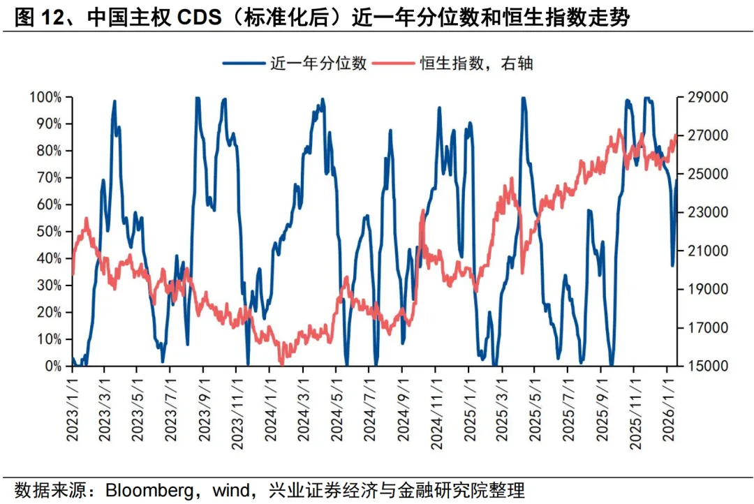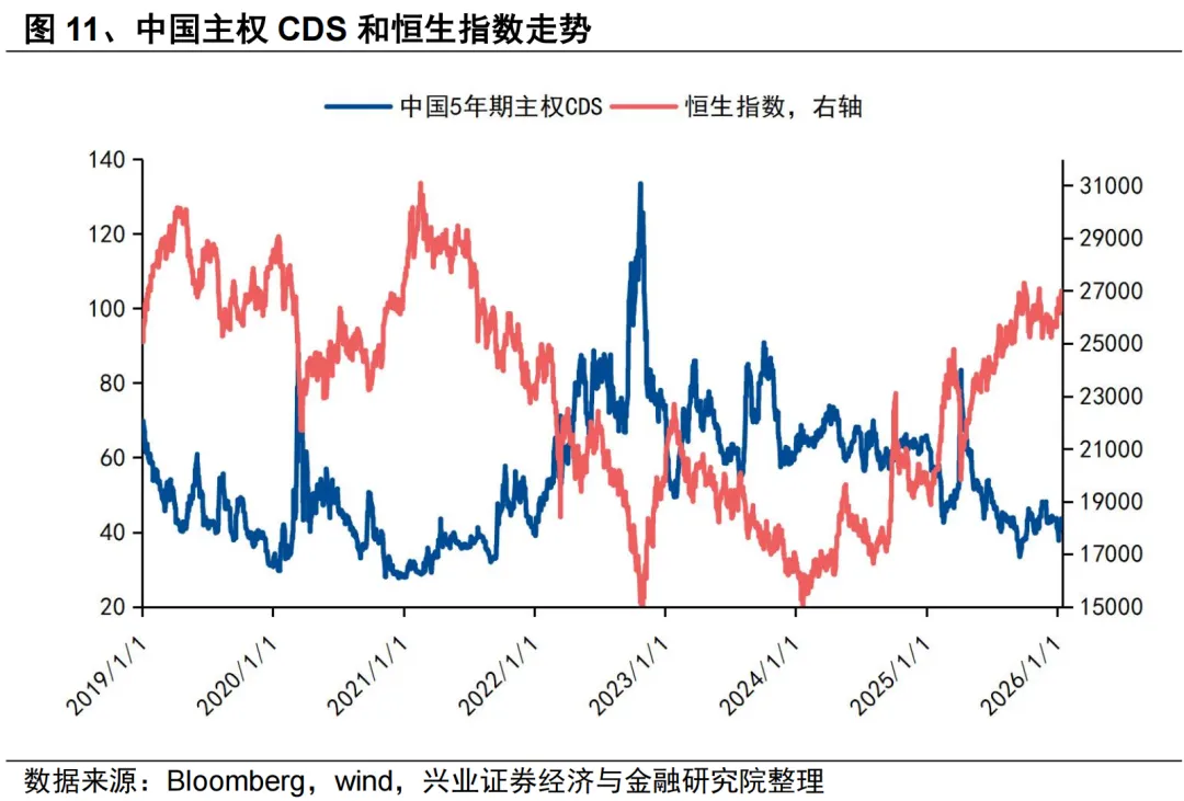 卖空资金作为市场的“逆势投资者“,其对于市场情绪和股价位置的变化或更为敏感。2019年以来,港股沽空金额占成交额的比重MA5在10%-20%的区间波动,和市场有较为明显的负相关性,对股价阶段性的高低点有较强的指示意义。经滚动一年分位处理后,30%和70%作为上下限阈值能够较好识别股价拐点区域。6.中国5年期主权CDS