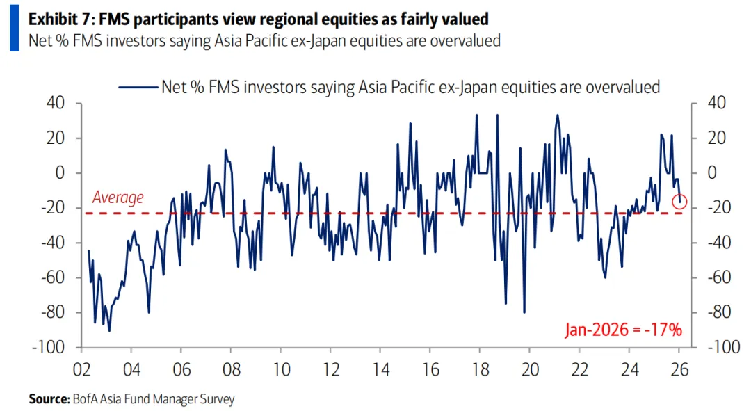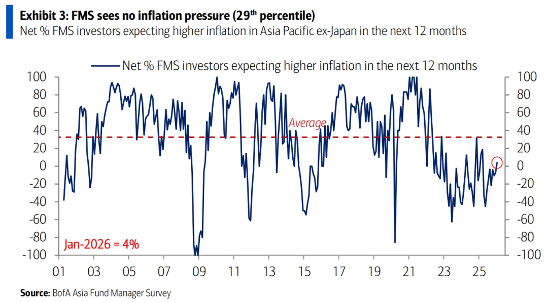 在通胀方面,市场普遍预期较为温和。这为亚洲(除日本外)的中央银行维持宽松的货币政策提供了空间。调查显示,净4%的基金经理预计未来12个月亚太地区(除日本外)的通胀将走高,这一比例处于29%的历史百分位,显示市场并未过度担忧通胀压力(Exhibit 3)。