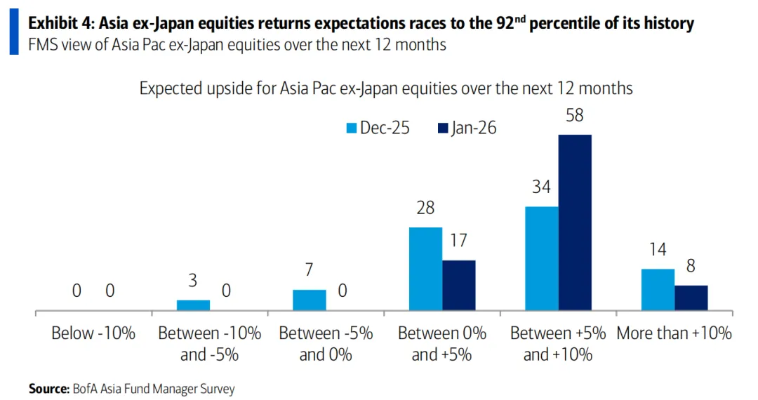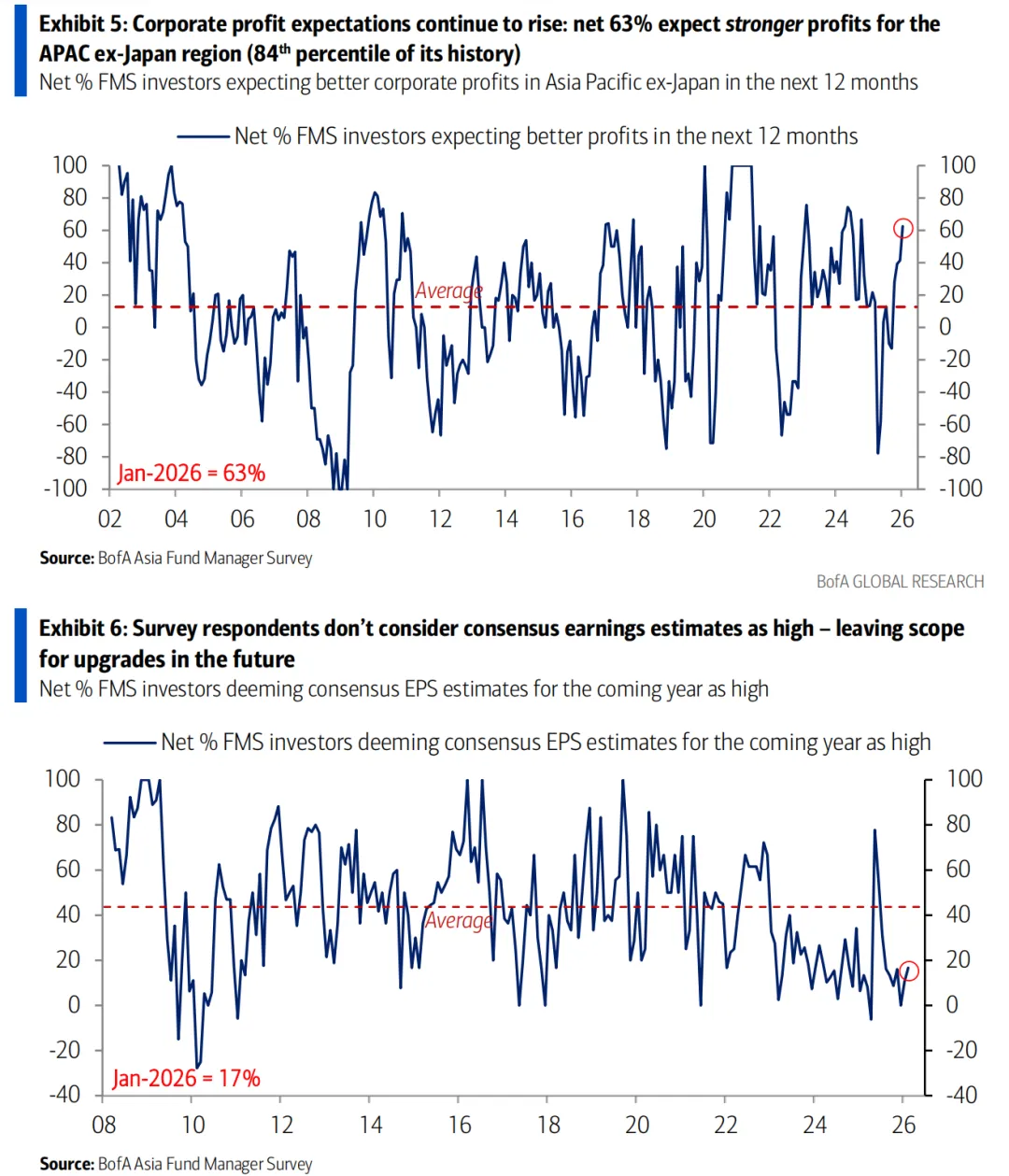 市场对未来回报的预期非常积极,达到了历史调查的第92个百分位。这主要得益于强劲的盈利反弹预期(目前处于历史前20%的高位)以及相对公允的估值水平。具体来看,58%的受访者预计未来12个月亚太(除日本外)股市的涨幅将超过10%(Exhibit 4)。