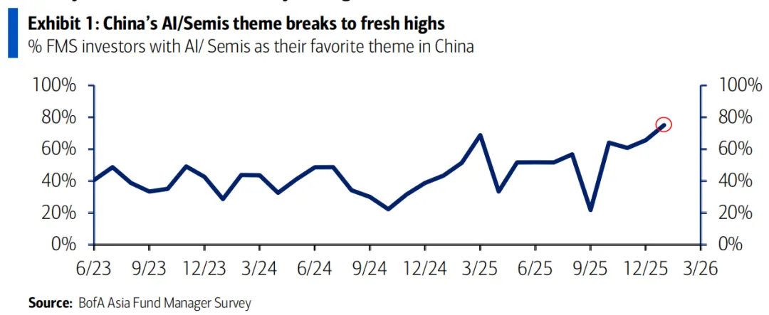 中国的增长势头正在企稳并逐步改善,长期结构性风险的叙事不再一边倒地悲观。家庭风险偏好开始回升,资金有从储蓄转向投资的趋势。调查显示,认为中国经济将走强的基金经理比例由负转正,净13%的受访者预期经济将更强劲。同时,认为中国股市处于结构性降级过程中的投资者比例降至38%,为调查开始以来的最低点。人工智能(AI)和半导体是中国市场最受关注的主题,其中AI/半导体作为首选主题的比例创下新高,达到66%(Exhibit 1)。