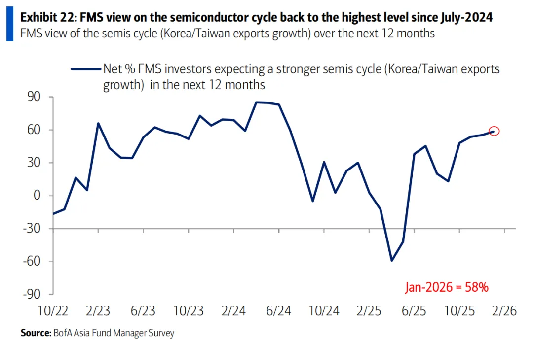 投资者对韩国和中国台湾市场保持建设性看法,主要得益于对半导体周期走强的坚定预期。目前,预期半导体周期将改善的受访者比例已接近三年高点(Exhibit 22)。在韩国,投资者对“企业价值提升计划”的有效性在选举后变得更为乐观。