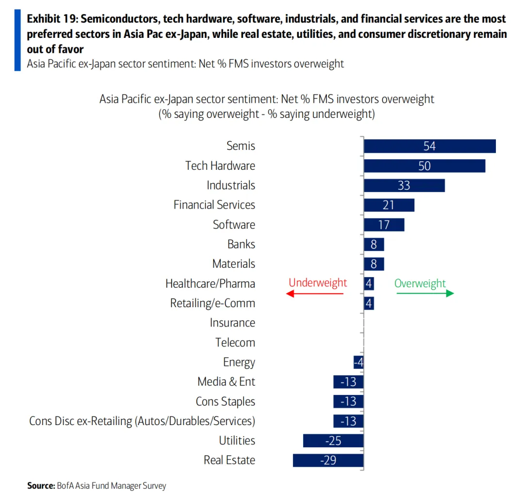 亚太(除日本外)市场: 半导体、科技硬件、软件、工业和金融服务是最受青睐的行业。而房地产、公用事业和非必需消费品则最不被看好(Exhibit 19)。