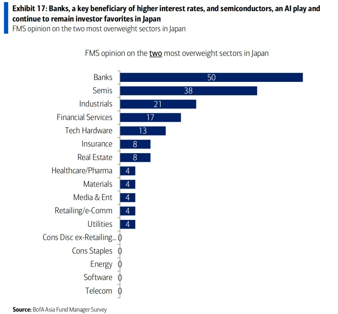 日本市场: 银行和半导体是投资者最超配的两大行业。银行作为利率上升的受益者,而半导体则被视为人工智能(AI)的重要一环(Exhibit 17)。