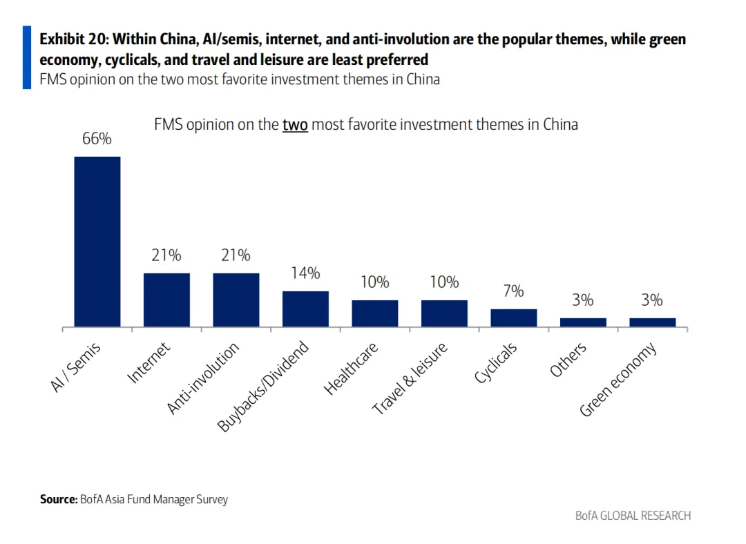中国市场: 人工智能/半导体、互联网和“反内卷”是三大热门投资主题,而绿色经济、周期股以及旅游休闲则是最不受欢迎的主题(Exhibit 20)。