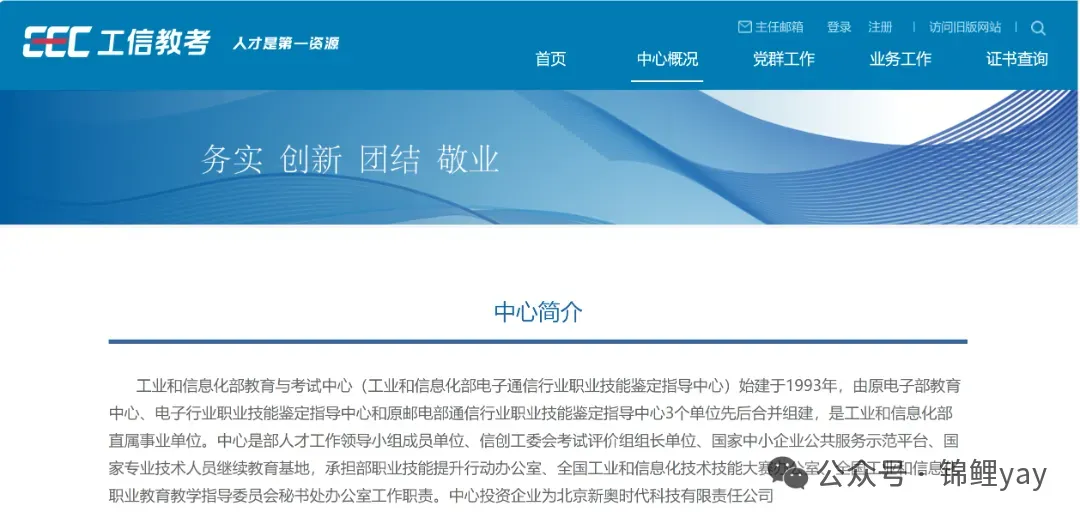 工业和信息化部教育与考试中心是经中央机构编制委员会办公室批准设置的事业单位,在工业和信息化部领导下,承担工业、通信业和信息化系统专业人才培训及相关资格考试的有关工作。