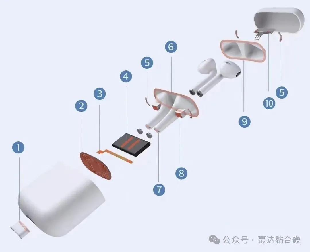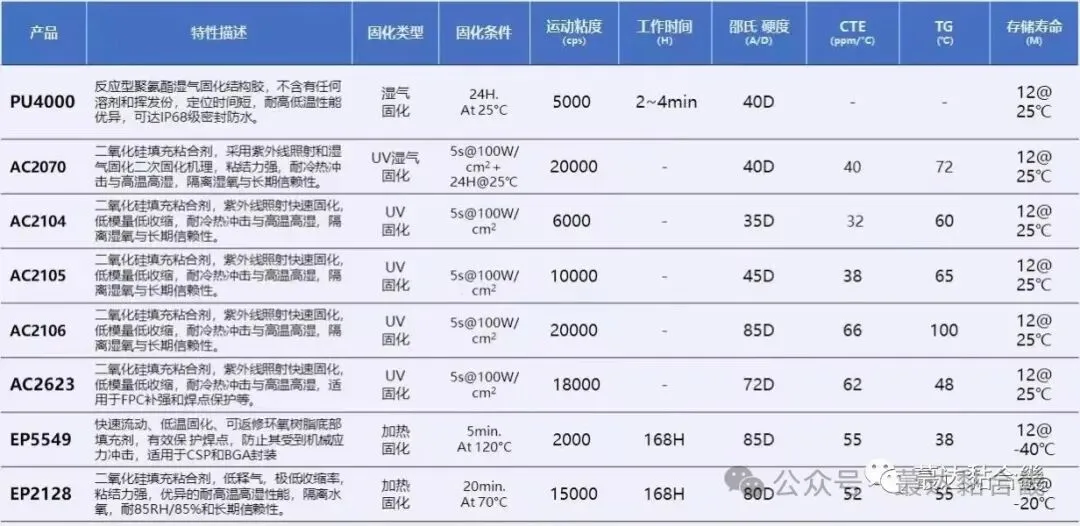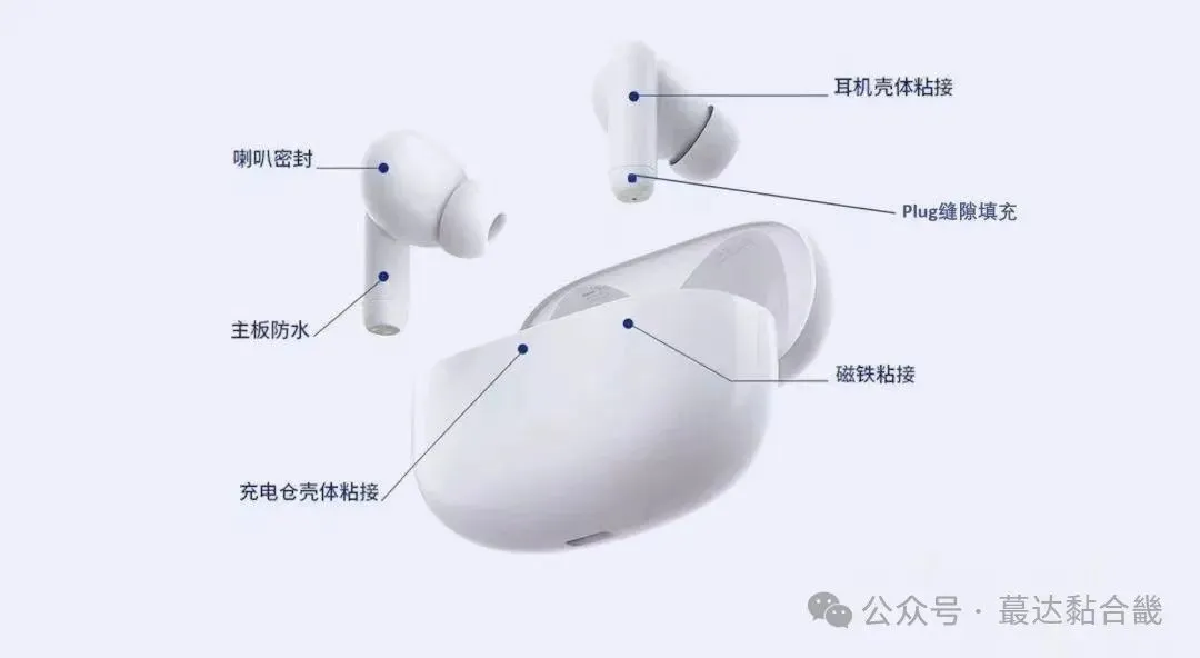 5、蕞达公司TWS蓝牙耳机封装材料介绍 TWS无线耳机设计小巧,需要在本来就很小的空间里装入更多的功能模块和更大的电池,保证功能稳定性的同时,对防摔抗震能力要求也极为严格,部分产品还要求具备防水能力。在生产工艺的不断变革中,封装粘合剂成为耳机组装过程中的最佳选择,保证牢固可靠的同时,不额外增加其他零部件,不占体积,从而最大程度降低故障率。针对TWS封装工艺要求,蕞达公司推出TWS无线耳机封装粘合剂系列,详细参数如下图所示。 ![]() |