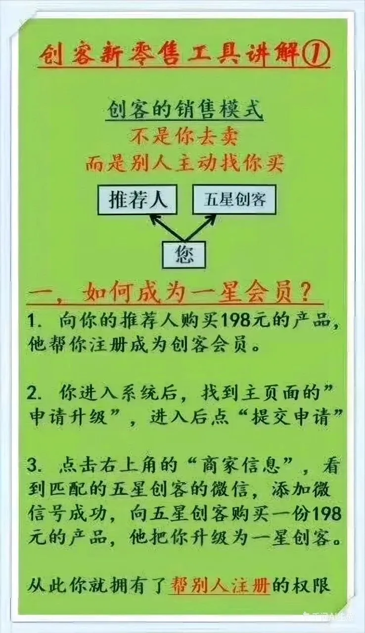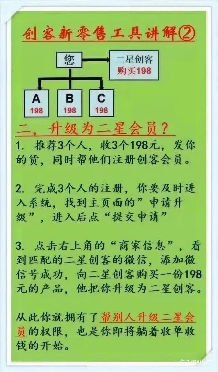 使用这个工具呢,首先是推荐人帮我们注册,我们点击后台系统,点击《申请升级》后提交申请,系统会弹出来两个商家的信息,第一个就是我们的推荐人,第二个是我们的九星商家。我们加她的徽信给她转198元,给九星商家转198元,找他们消费两单产品。如果说我们的推荐人是开饭店的,那么我们就带两个朋友去她里吃顿饭花198元,如果说九星商家是卖水果的,我们就花198元找他们买水果,然后把水果拿回家自己吃。请问我们有没有什么损失?是不是就正常的消费了两单产品,对吗?这个时候我们的推荐人就好比给了一个门面,我们的九星商家就好比给了个营业执照。那么我们有了门面,有了营业执照,按照传统生意的方式,是不是要去找客户?请员工?还要去装修?但是在这里就不用了,我们只需要发现一个问题,我们身边有没有想卖货的朋友?打开手机,80%以上都是想卖货给我们的,对不对?你看我们走到大街上面,走到哪里都是想卖货的。每次有朋友打电话约我们喝茶,约我们吃饭,是不是一见面,头上就写了几个大字:“我要成交你”,这个时候你头上也可能会出现:“我偏不给你成交,我还要成交你”,所以说在这个社会当中,我们都在相互个社会当中,我们都在相互的成交,不是在被别人成交,就是在成交别人。所以非常的辛苦。
